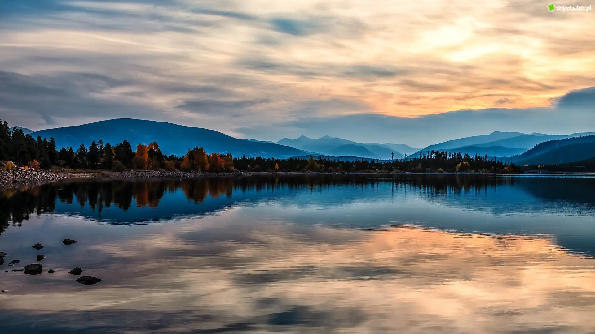 Zdjęcie Wschód słońca, Jezioro, Dillon Lake, Góry, Drzewa, Chmury, Odbicie, Kolorado, Stany Zjednoczone |