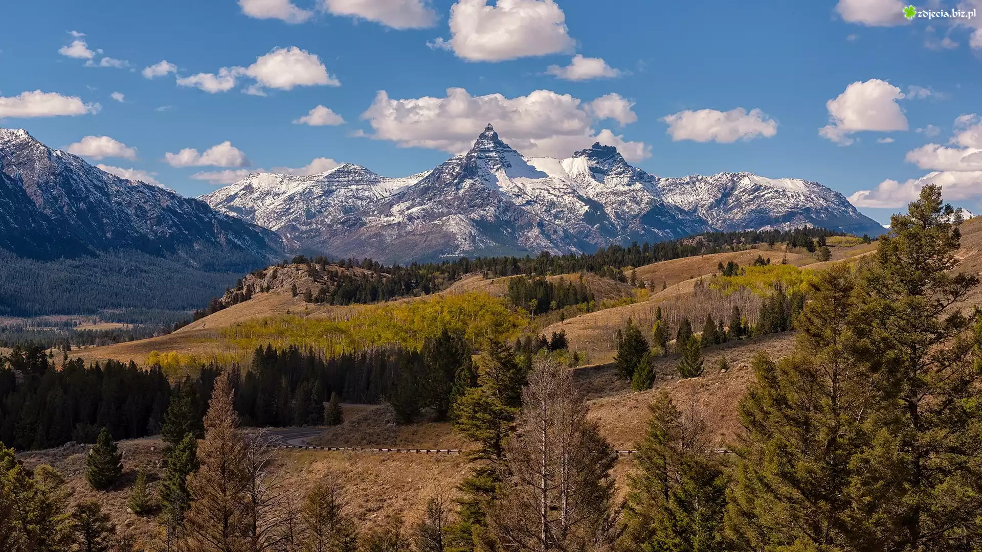 Zdjęcie, Góry, Absaroka Range, Szczyty, Drzewa, Wzgórza, Wyoming, Stany Zjednoczone