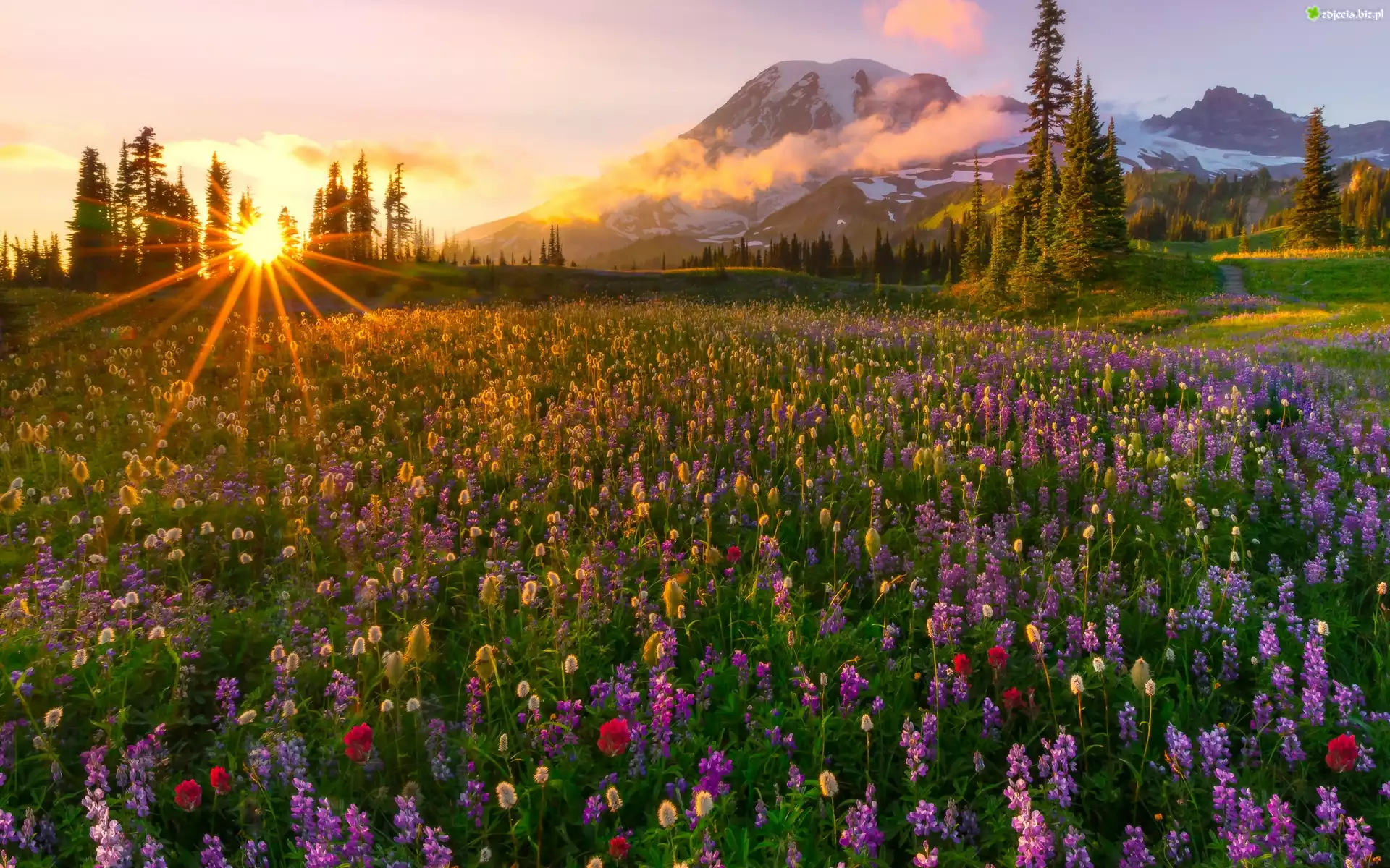 Zdjęcie Góry, Las, Łąka, Kwiaty, Zachód Słońca