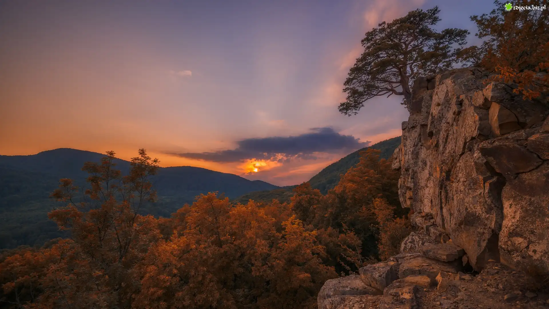 Zdjęcie Góry, Drzewa, Jesień, Skały, Zachód słońca