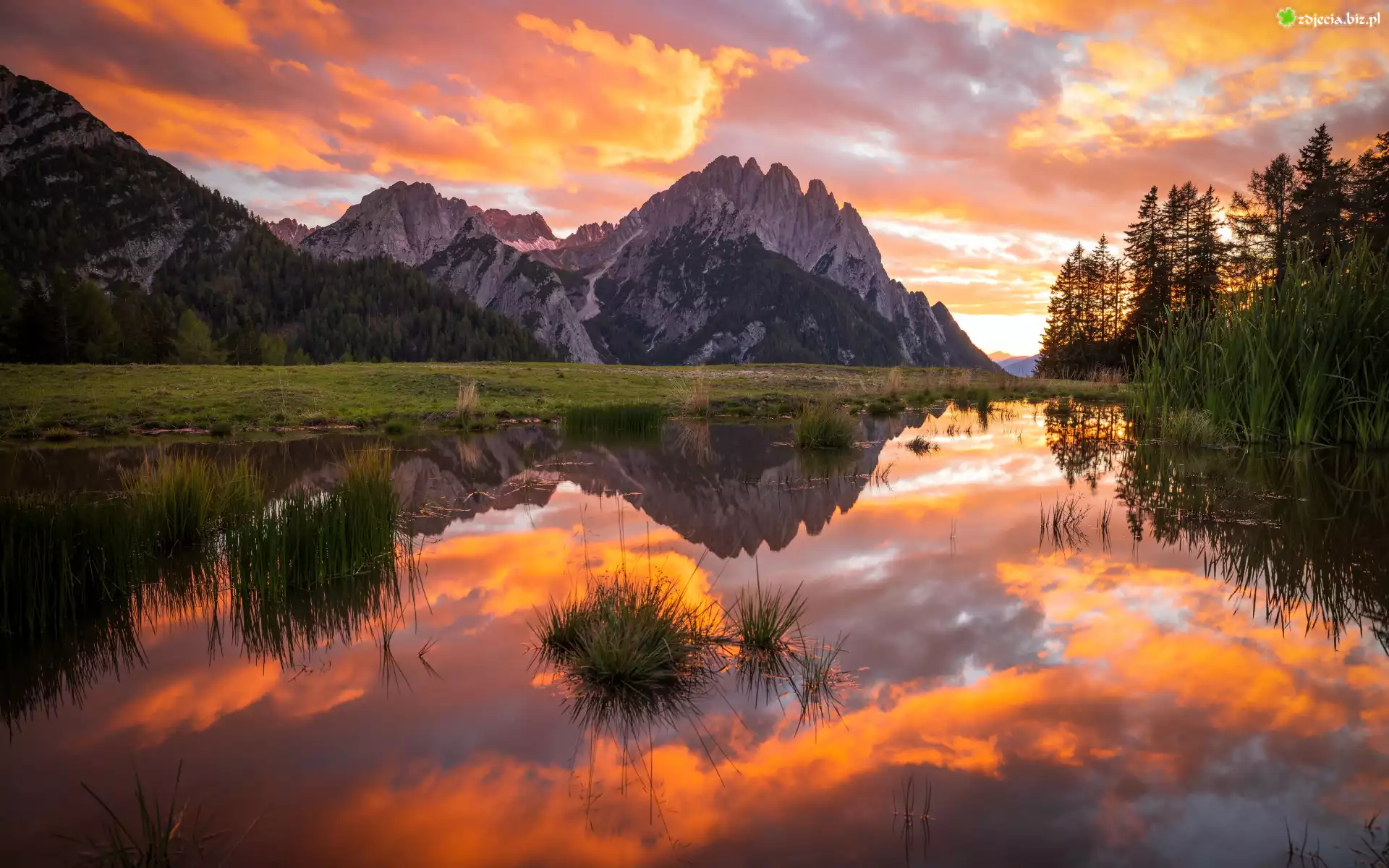Zdjęcie Austria, Góry, Skały, Jezioro, Drzewa, Trawa, Szuwary, Chmury, Odbicie, Zachód słońca