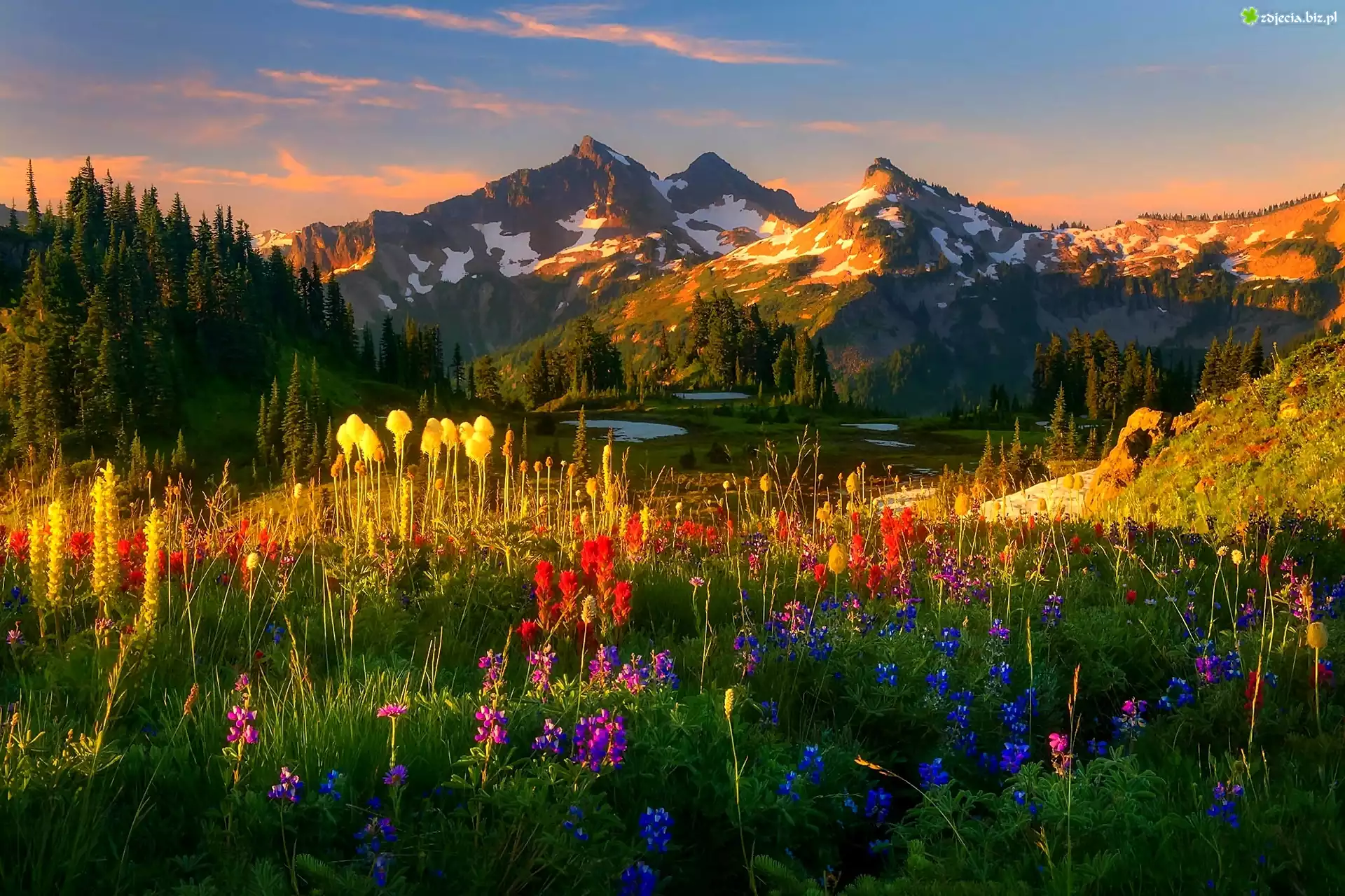 Zdjęcie, Góry, Kwiaty, Kolorowa, Łąka, Zachód Słońca