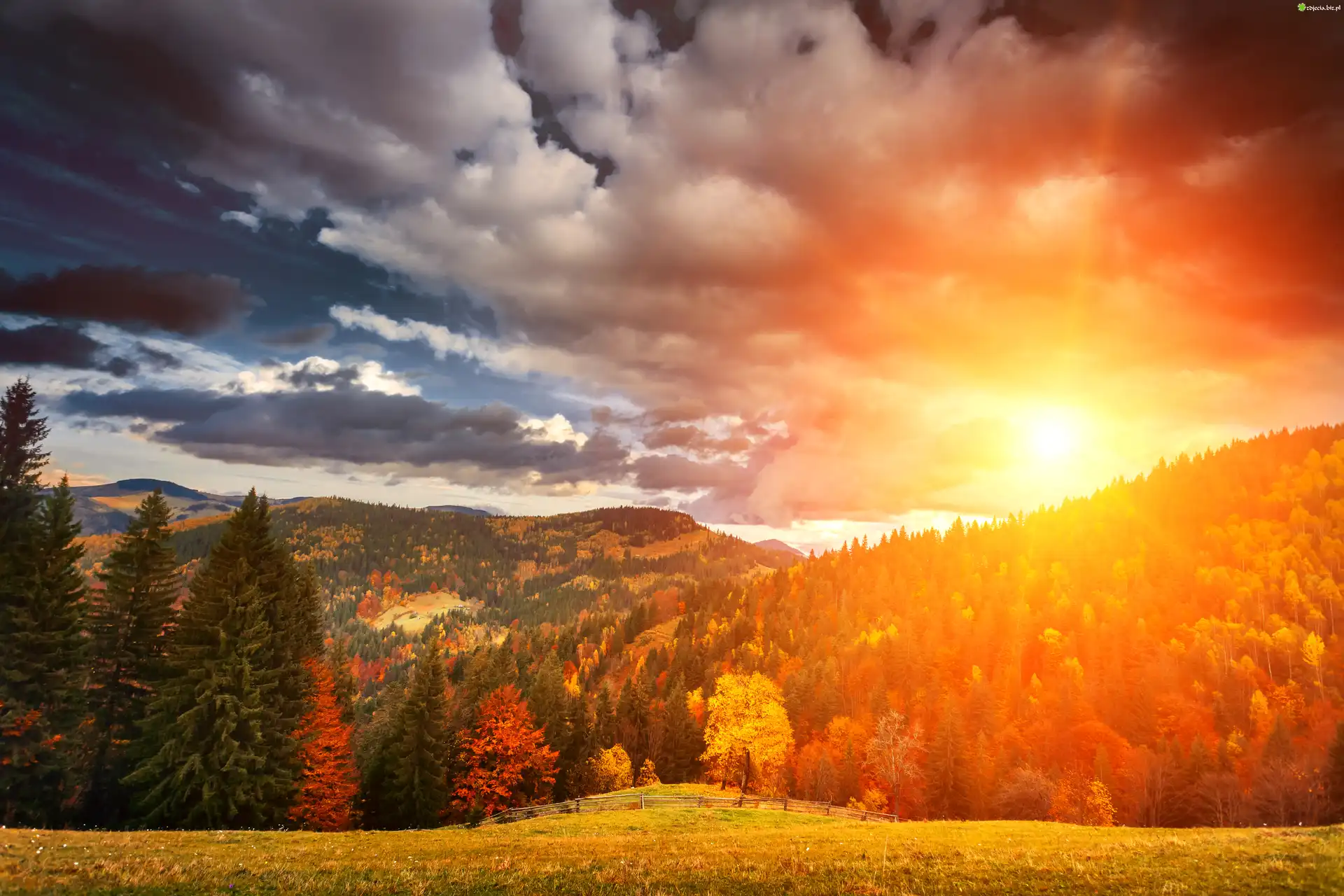 Zdjęcie Góry, Jesień, Las, Zachód słońca