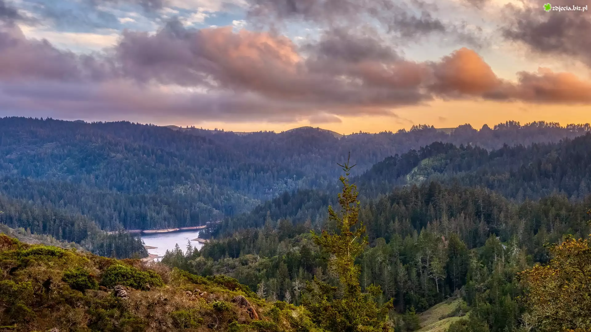 Zdjęcie Zalesione, Góry, Wzgórza, Jezioro, Zachód słońca, Chmury