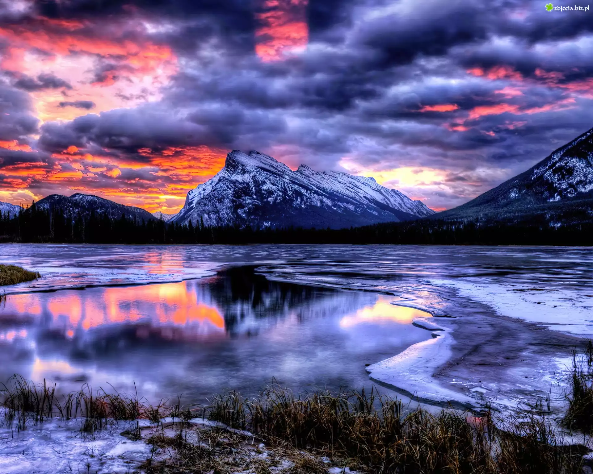 Zdjęcie Góry, Zachód, Słońca, Zamarznięte, Jezioro
