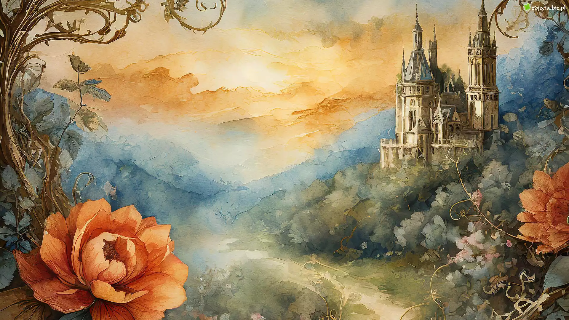 Zdjęcie Obraz, Malarstwo, Zamek, Góry, Droga, Kwiaty, Drzewo