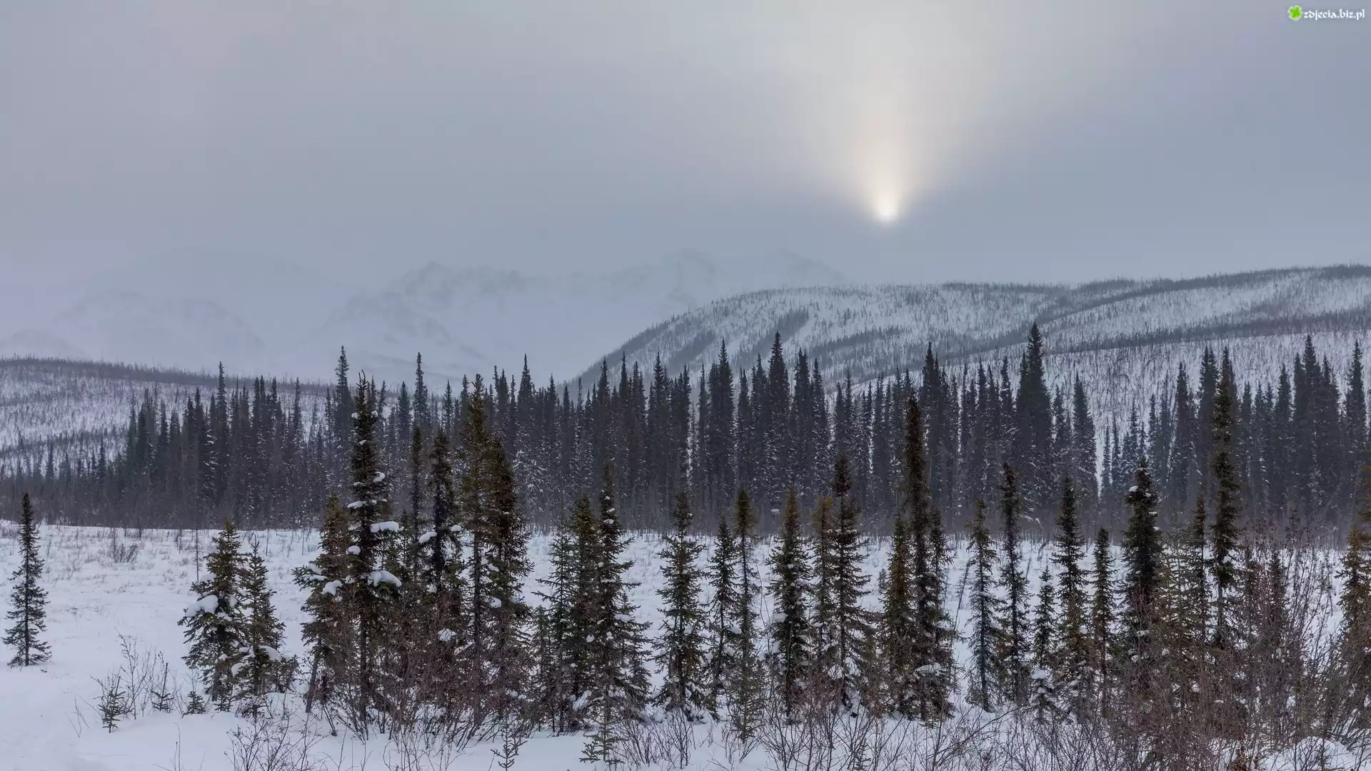 Zdjęcie Góry, Drzewa, Śnieg, Zamglone, Słońce