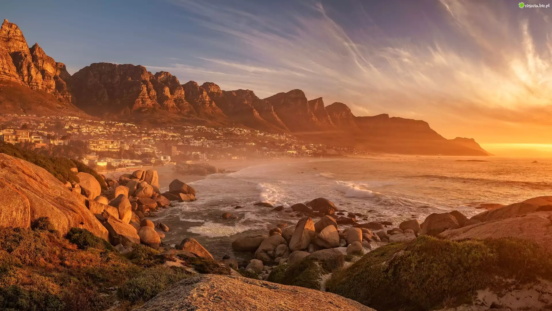 Zdjęcie Afryka, Republika Południowej Afryki, Kapsztadt, Morze, Góry, Zatoka, Skały, Zachód słońca