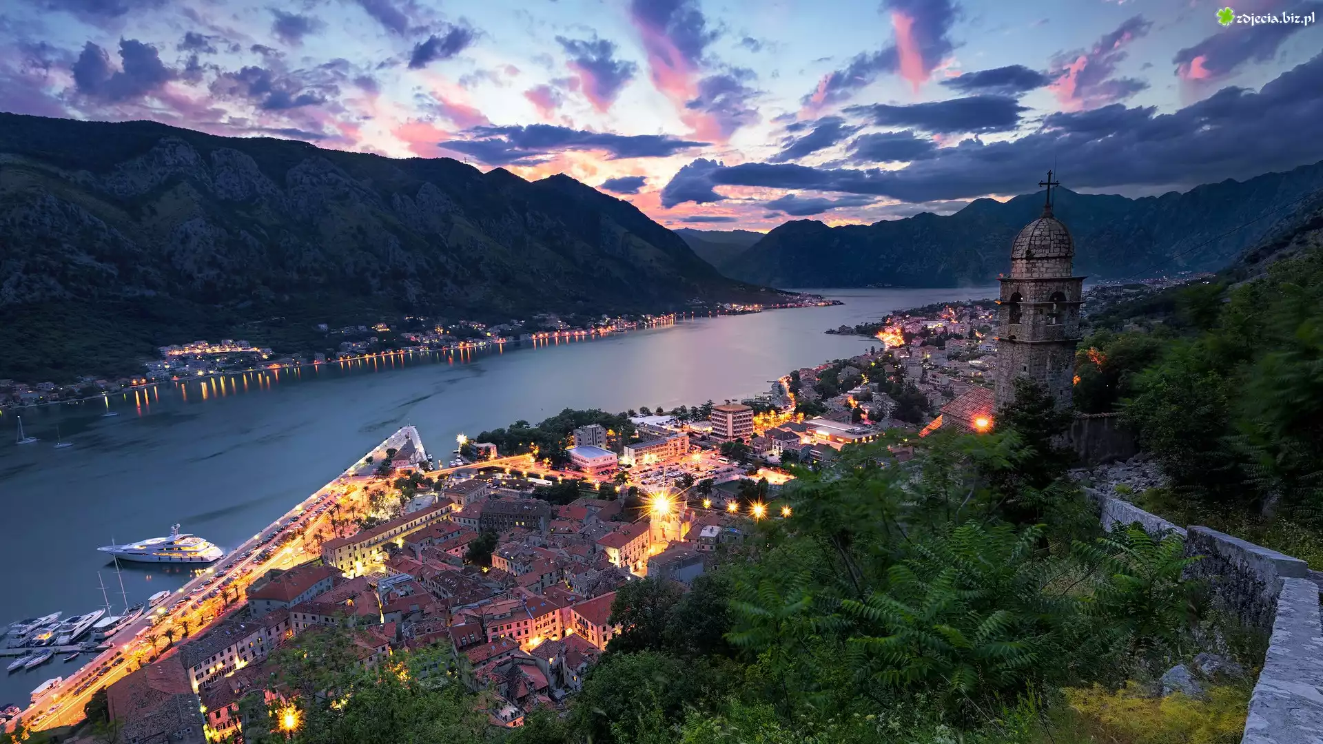 Zdjęcie Góry, Stare Miasto, Kotor, Domy, Światła, Zatoka Kotorska, Czarnogóra