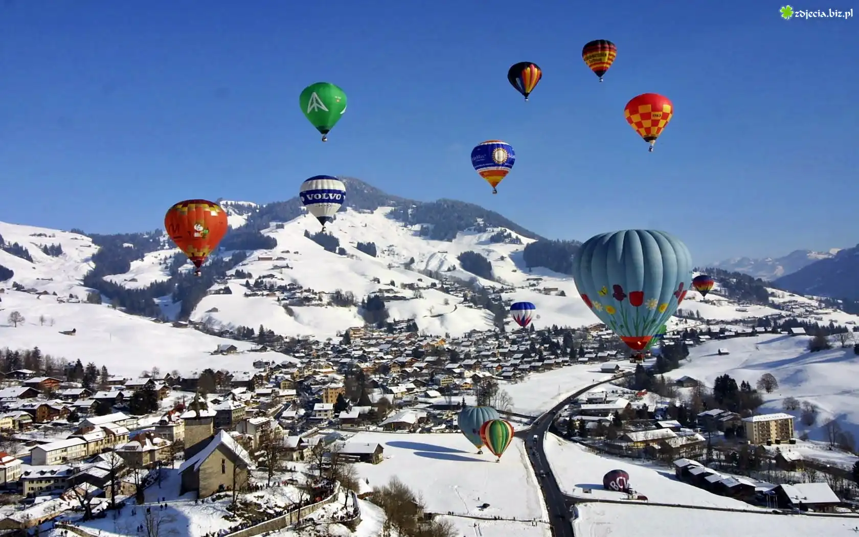 Zdjęcie Zima, Góry, Lasy, Panorama, Miasteczka, Zawody, Balonowe