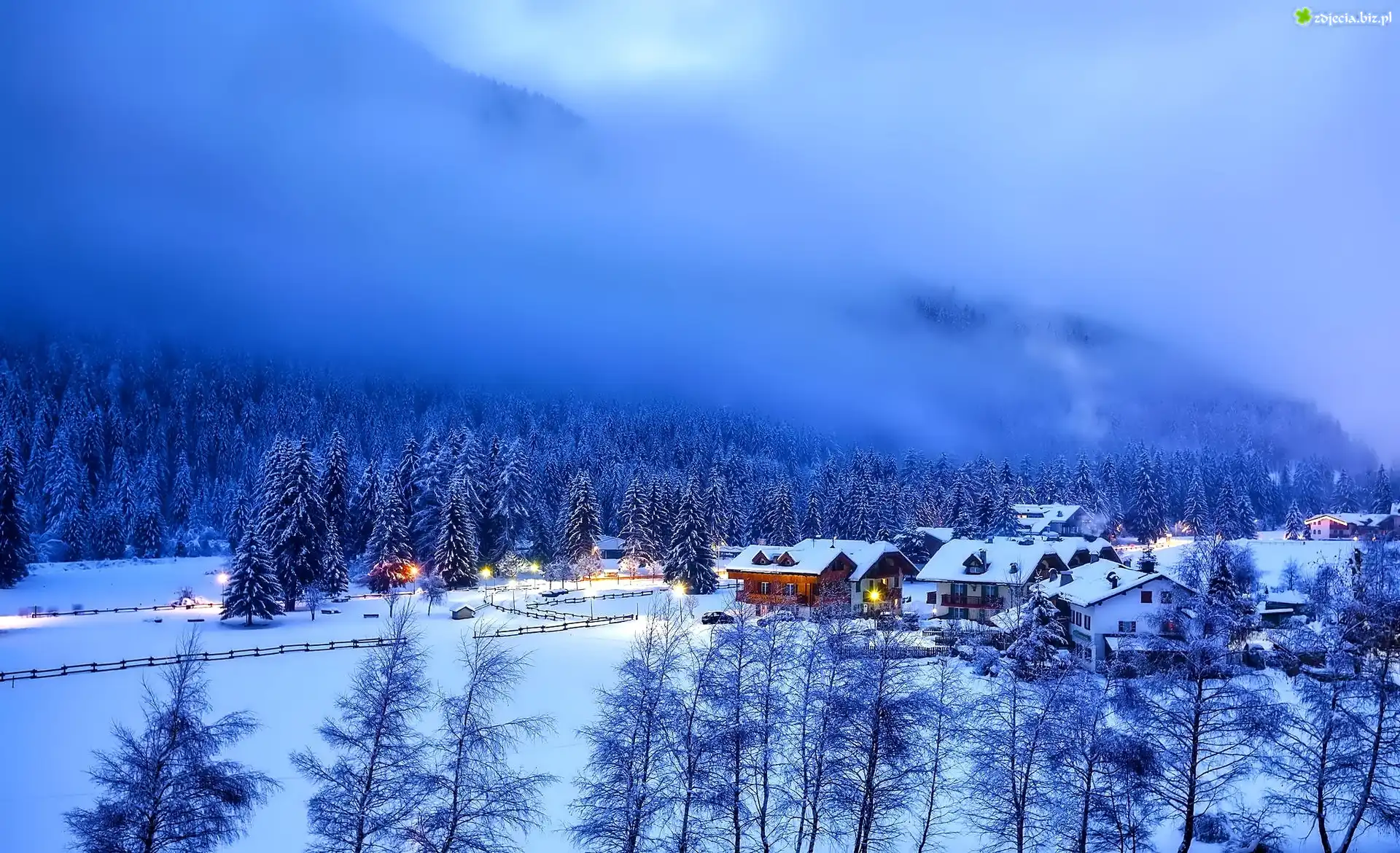 Zdjęcie Góry, Lasy, Domy, Zima, Mgła