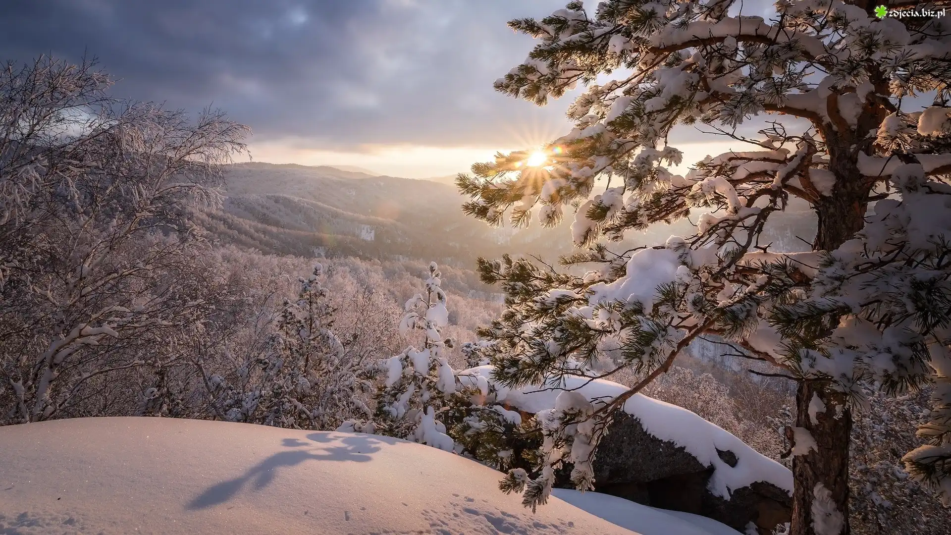 Zdjęcie Zima, Góry, Śnieg, Drzewa, Sosna, Słońce, Kamień