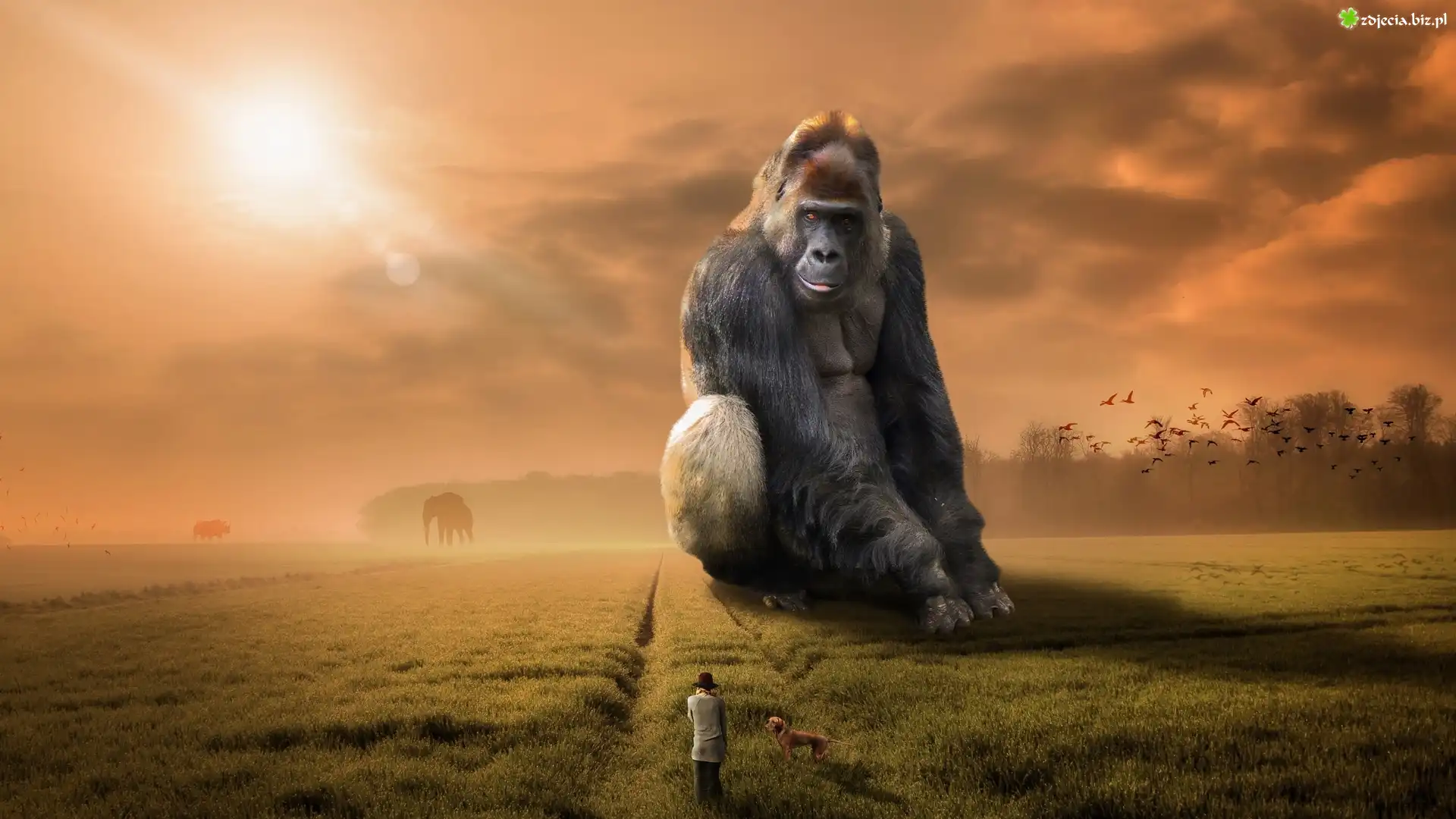 Zdjęcie Fantasy, Goryl, Kobieta, Pies, Słoń, Ptaki, Słońce