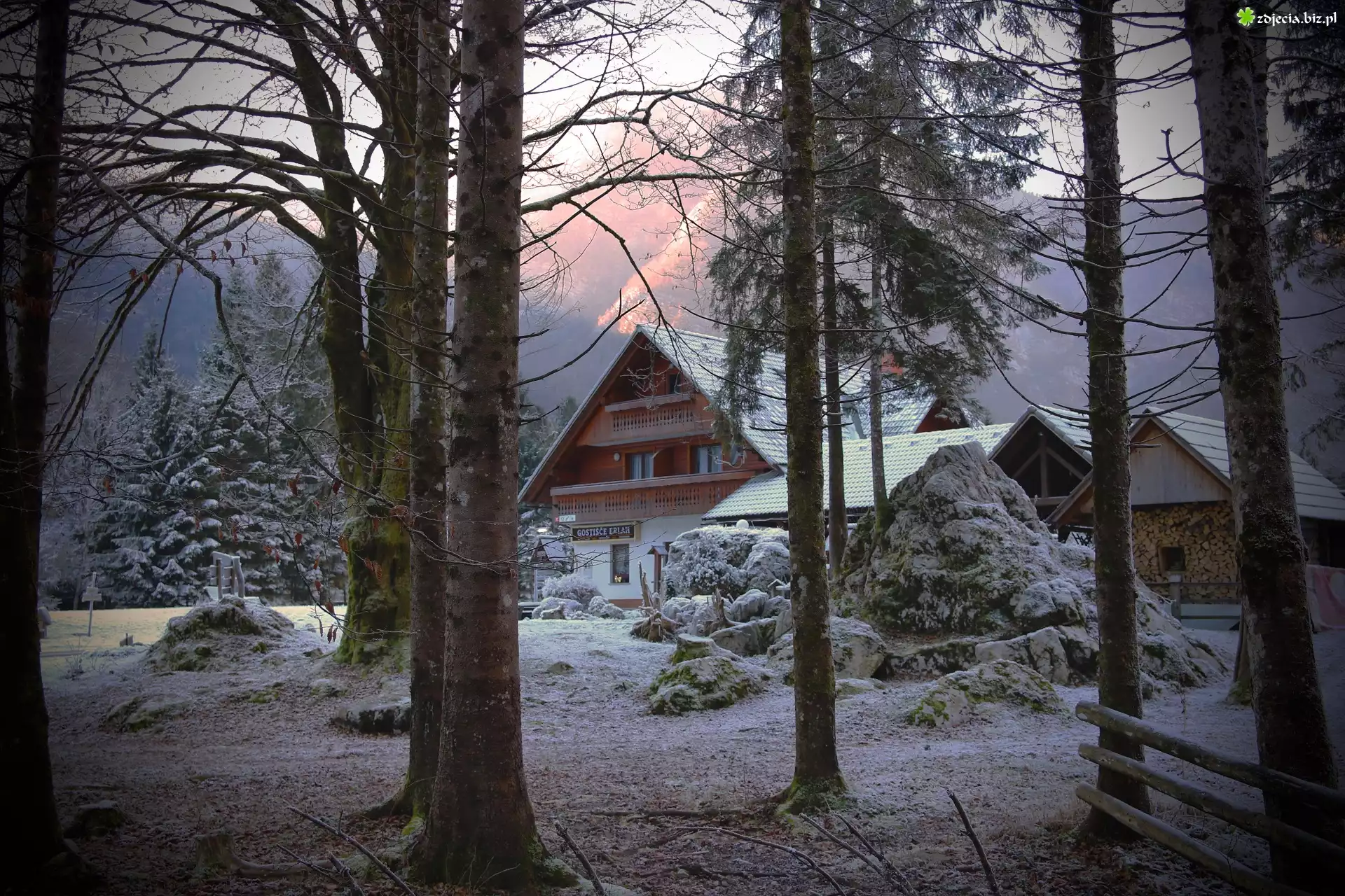 Zdjęcie Zima, Słowenia, Bohinj, Domek gościnny Erlah, Gostišče Erlah, Drzewa, Krzewy, Śnieg