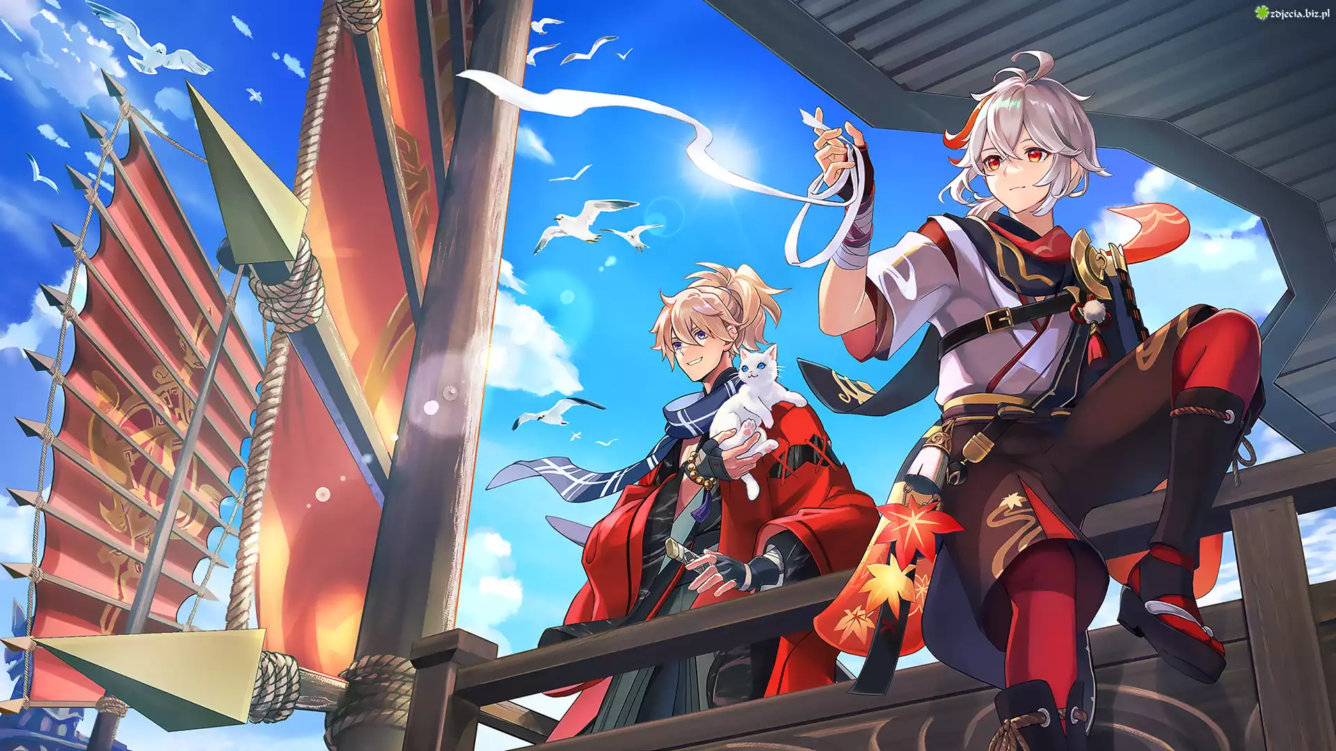 Zdjęcie Gra, Genshin Impact, Postaci, Kaedehara, Kazuha, Kot, Żaglowiec, Maszty