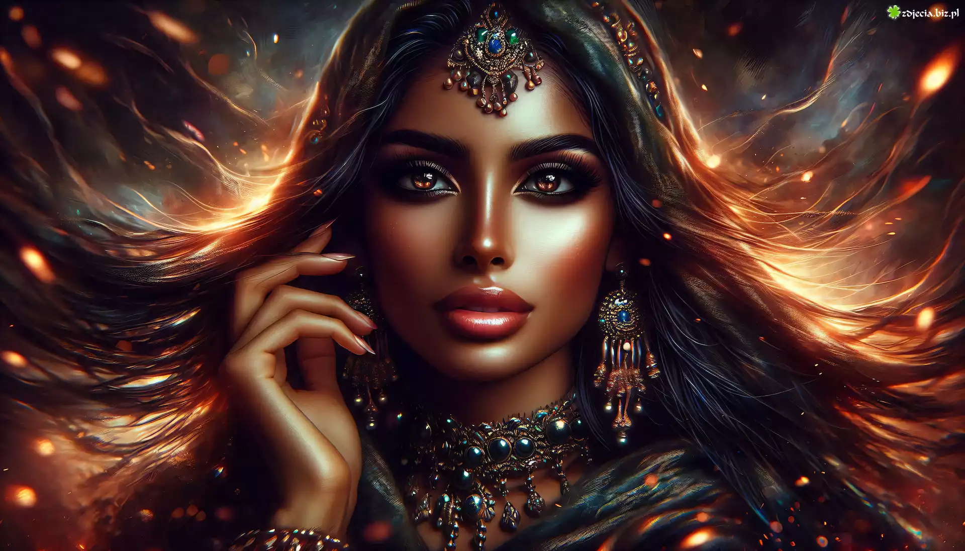 Zdjęcie Kobieta, Makijaż, Biżuteria, Naszyjnik, Kolczyk, Grafika, Włosy, Grafika