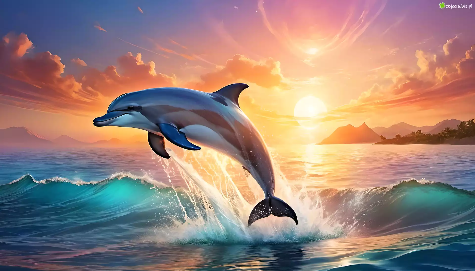 Zdjęcie Delfin, Niebo, Chmury, Grafika, Zachód słońca, Morze