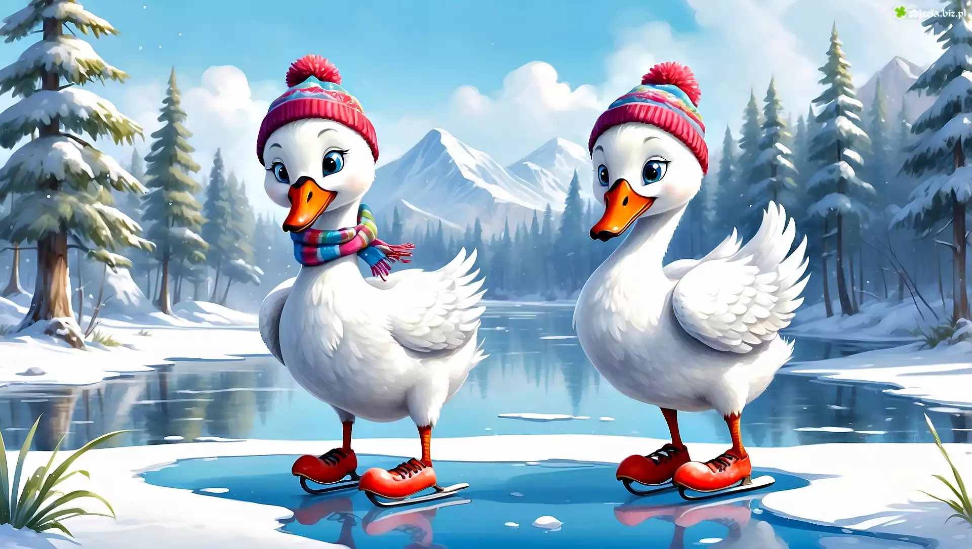 Zdjęcie Grafika, Kaczki, Czapki, Łyżwy, Zima, Góry, Drzewa, Jezioro, 2D