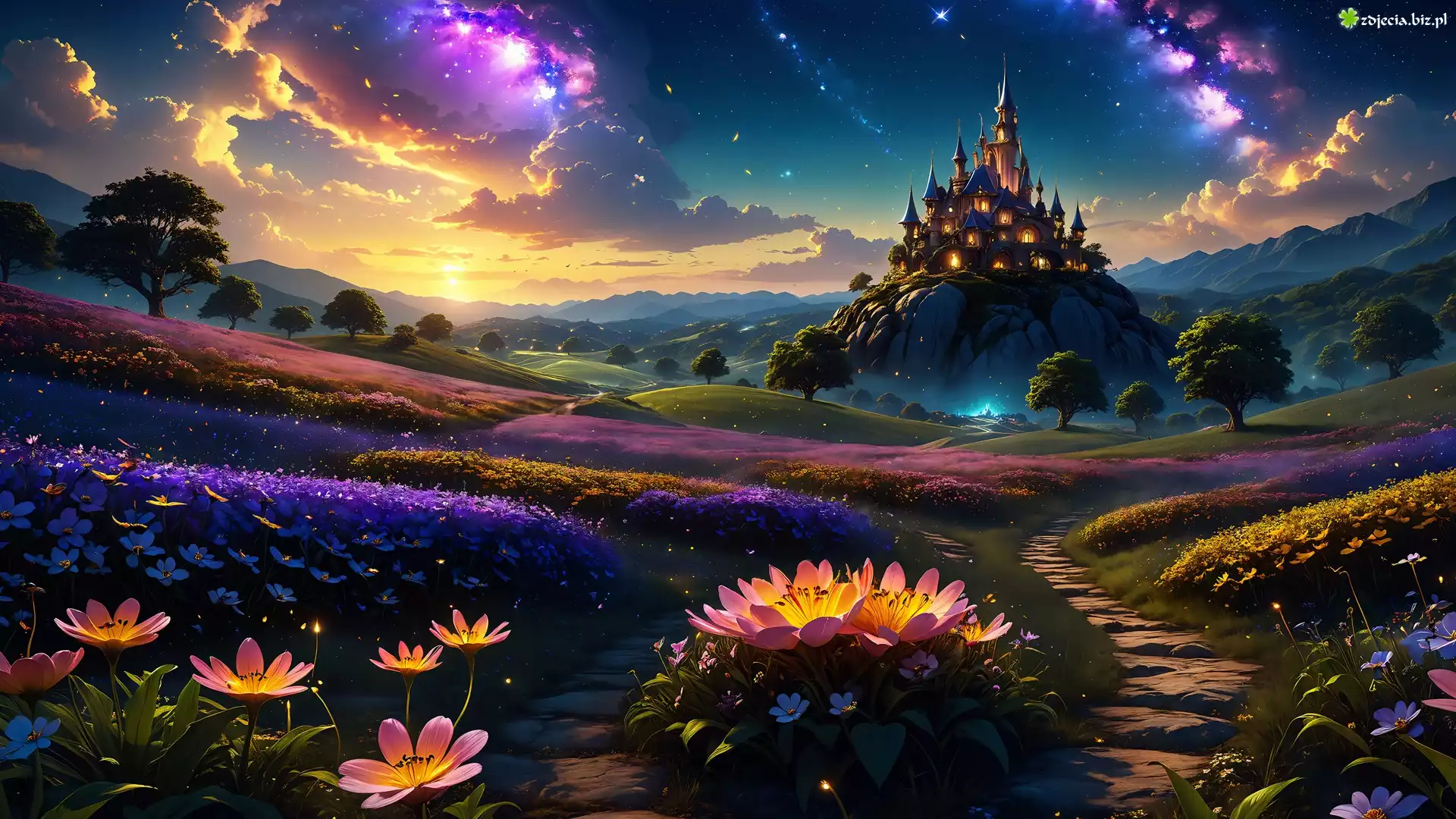 Zdjęcie Góry, Zamek, Drzewa, Łąka, Kwiaty, Zachód słońca, Grafika