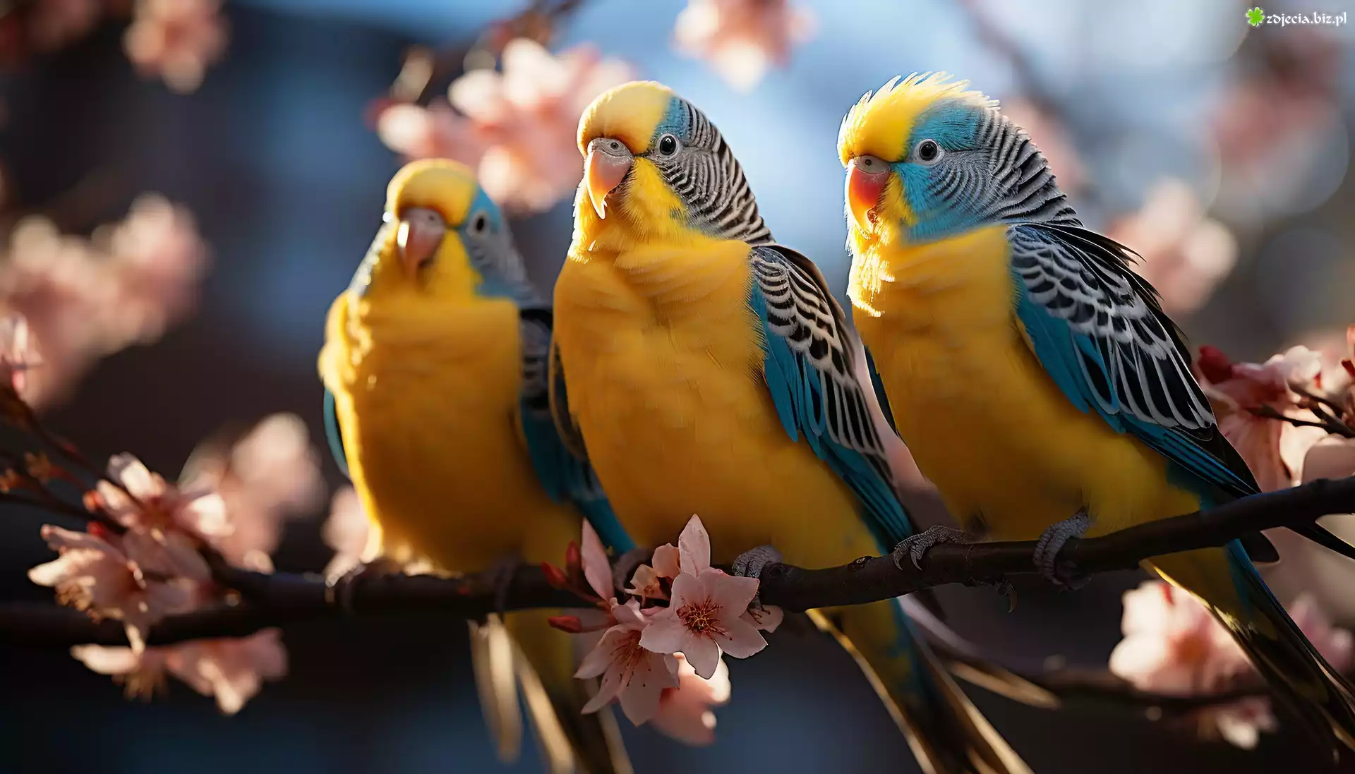 Zdjęcie, Papugi, Papużki faliste, Trzy, Ptaki, Gałąź, Kwiaty, Grafika