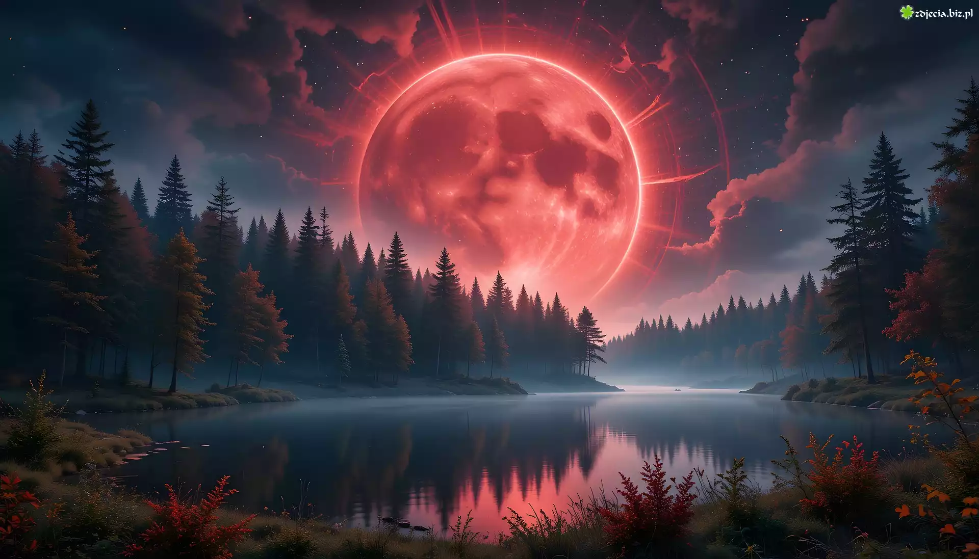Zdjęcie Jezioro, Drzewa, Księżyc, Grafika