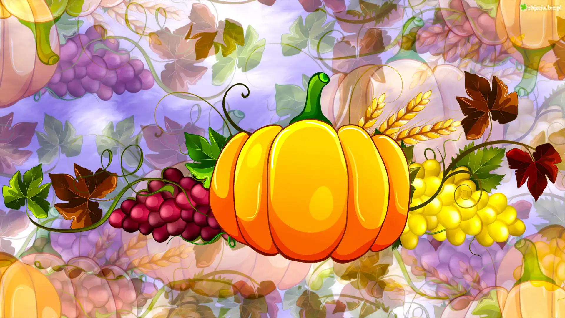 Zdjęcie Grafika, Dynia, Winogrona, Kłosy, Liście