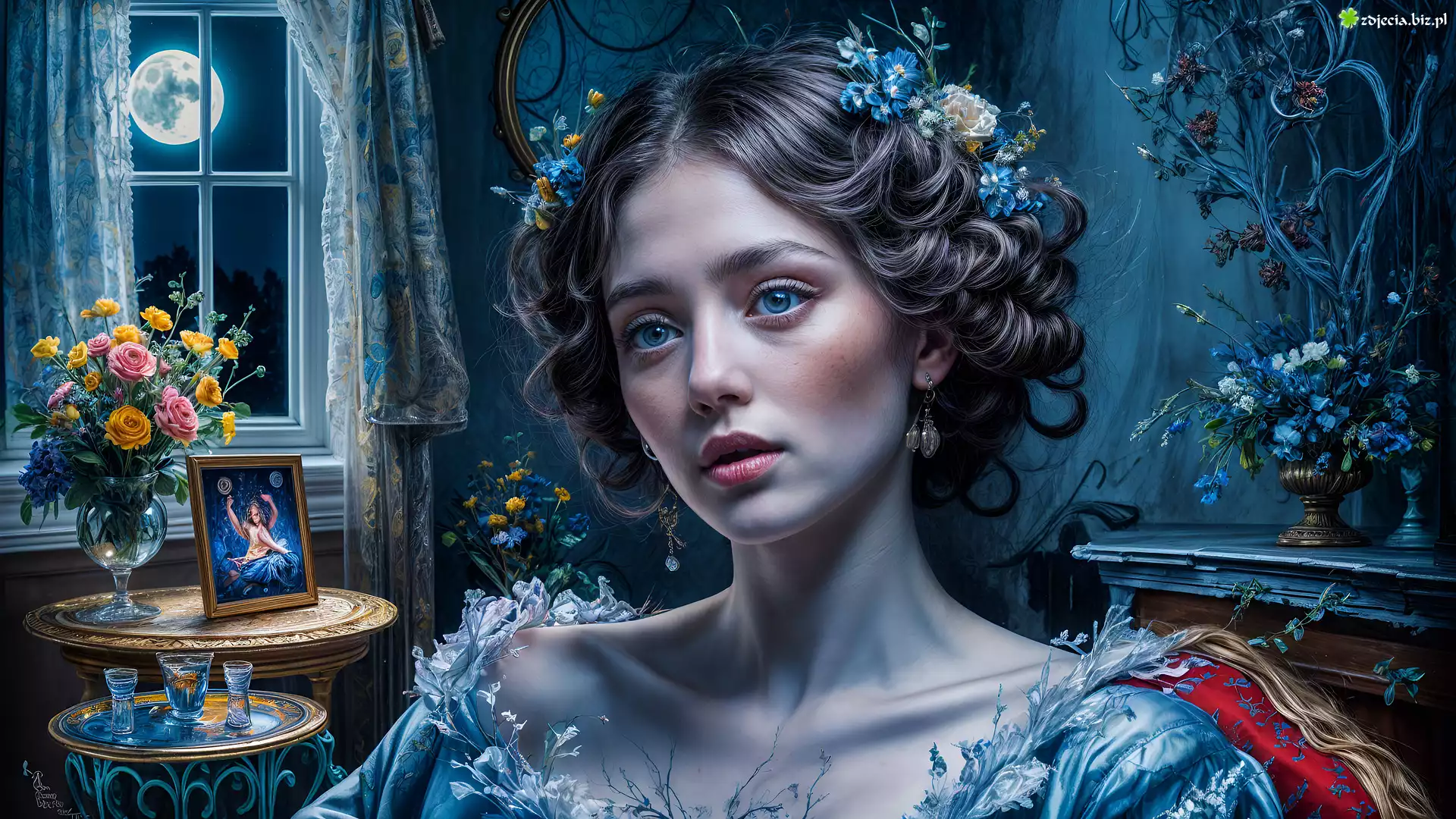 Zdjęcie Kobieta, Okno, Księżyc, Grafika