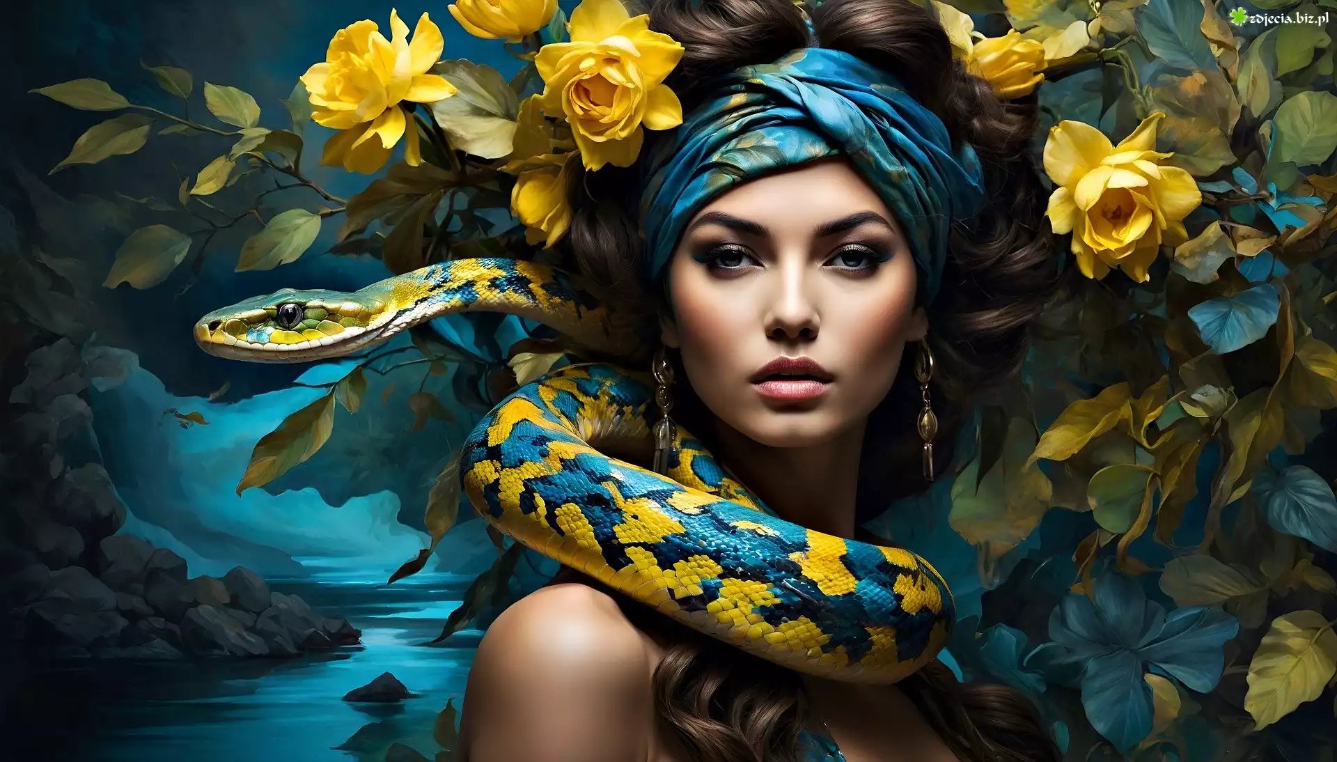 Zdjęcie Kobieta, Kwiaty, Wąż, Grafika