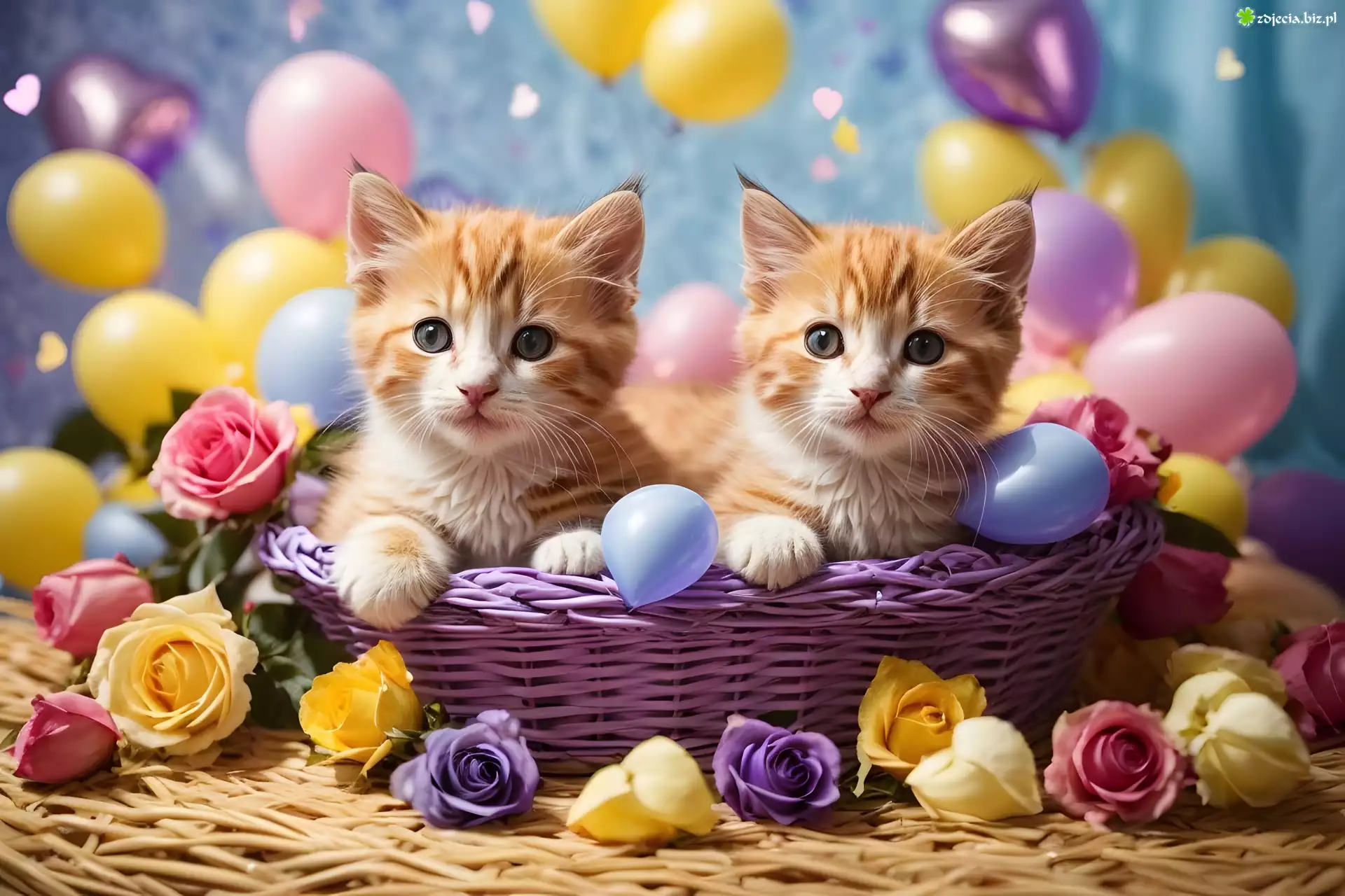 Zdjęcie Dwa, Koty, Kocięta, Koszyk, Kwiaty, Róże, Baloniki, Grafika