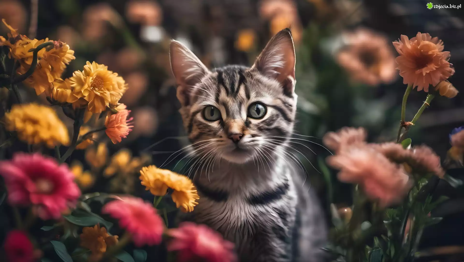 Zdjęcie Kot, Kocię, Kwiaty, Grafika