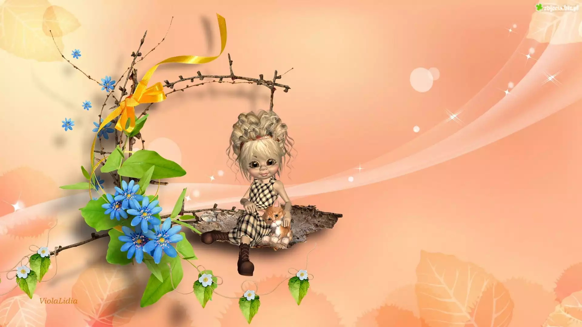 Zdjęcie Grafika, Laleczka, Kot, Kwiaty