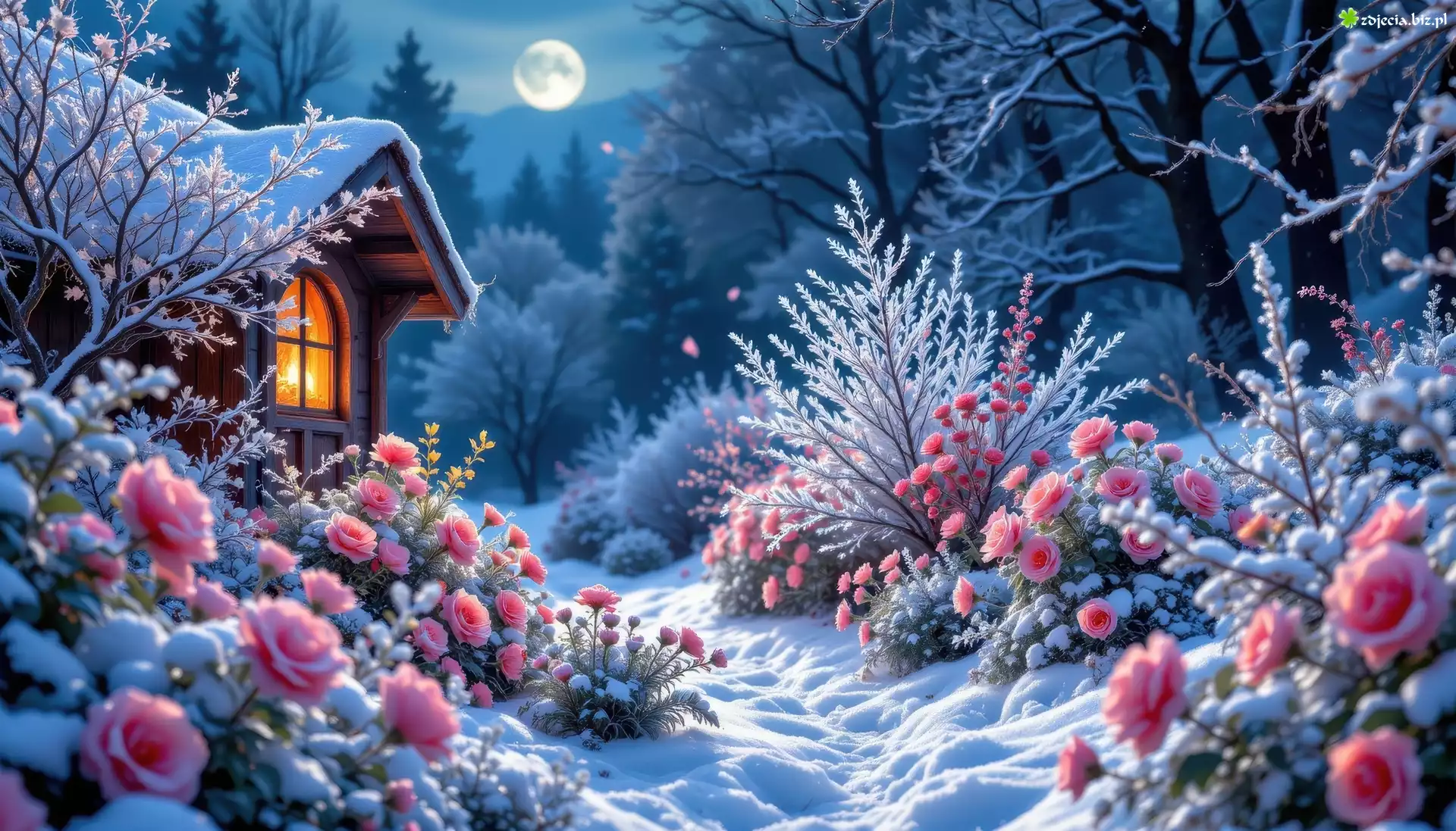 Zdjęcie, Grafika AI, Dom, Ogród, Zima, Drzewa, Kwiaty, Róże, Księżyc