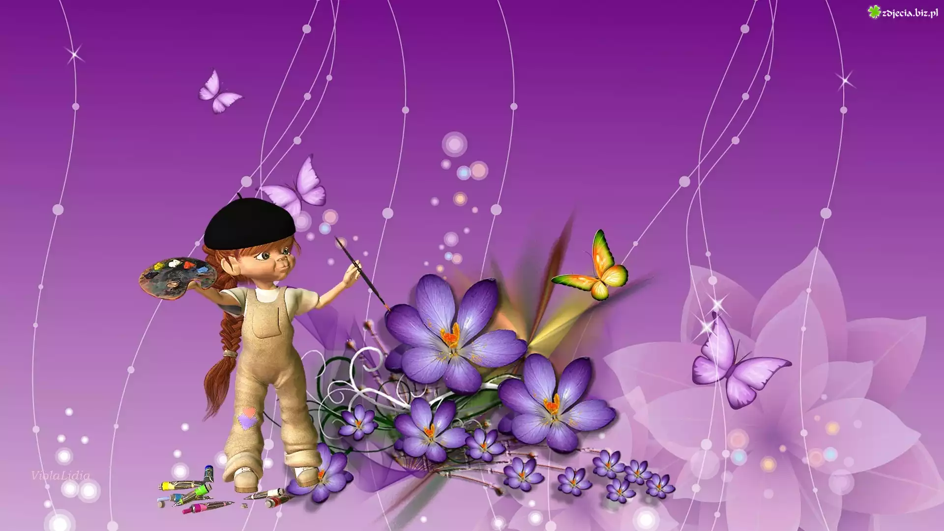 Zdjęcie Grafika, Laleczka, Malarka, Farby, Kwiaty, Motyle