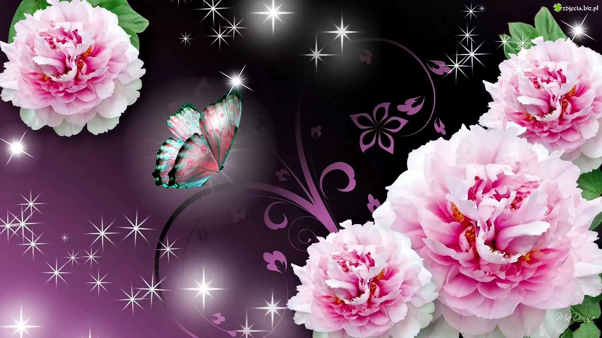 Zdjęcie Grafika, Gwiazdki, Motyl, Kwiaty, Piwonie
