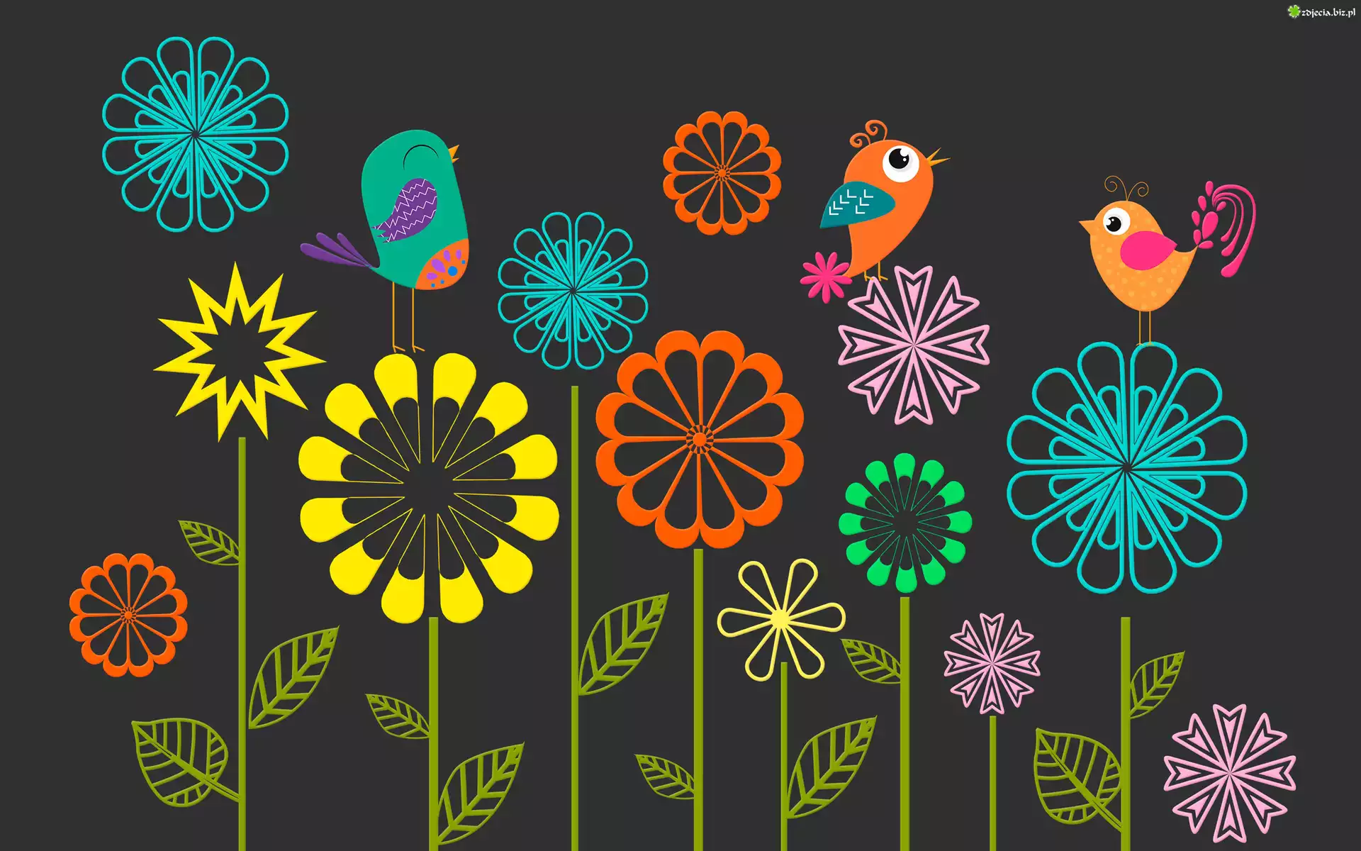Zdjęcie Grafika 2D, Motyw, Kolorowe, Kwiaty, Ptaki