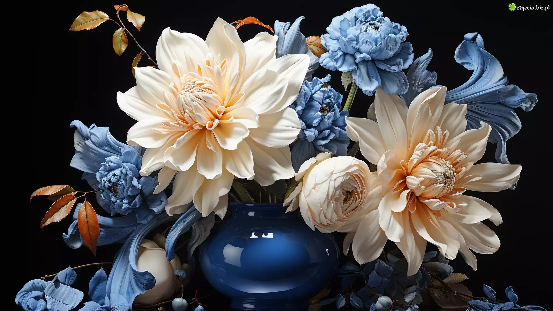 Zdjęcie Kremowe, Niebieskie, Kwiaty, Bukiet, Liście, Niebieski, Wazon, Grafika
