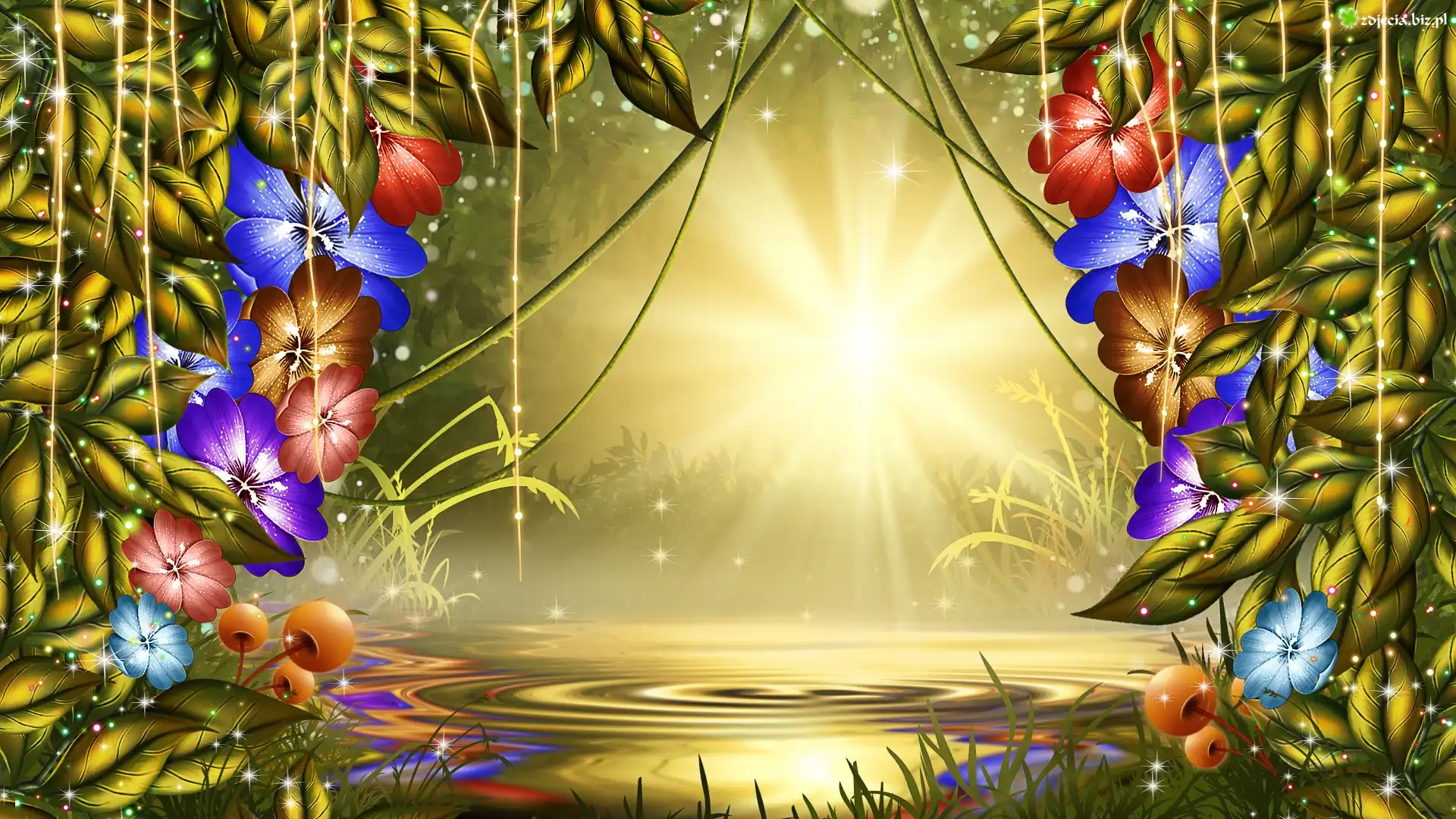 Zdjęcie Grafika 2D, Promienie słońca, Kwiaty, Staw