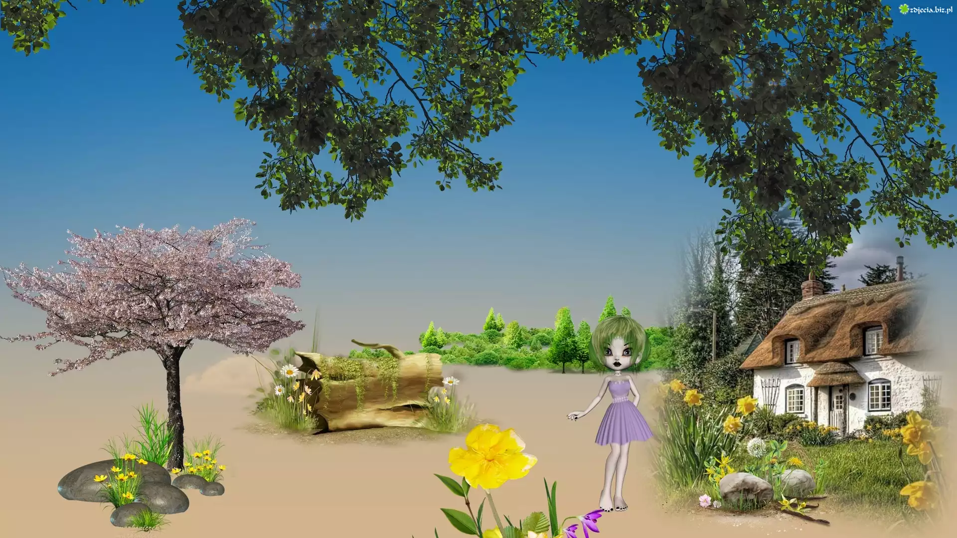 Zdjęcie Grafika, Drzewo, Dom, Laleczka, Kwiaty
