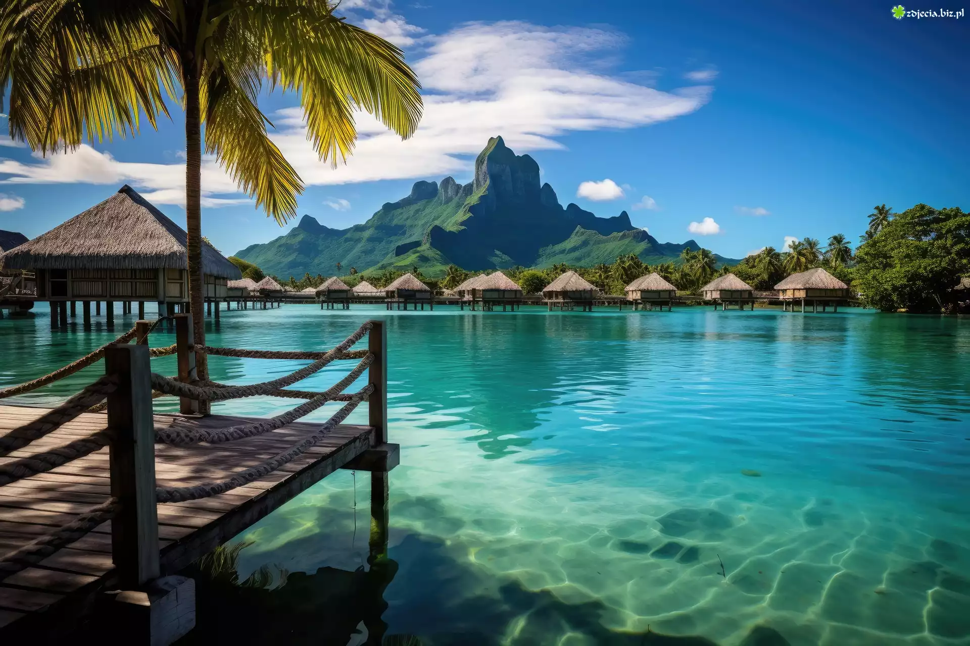 Zdjęcie Pomost, Morze, Palmy, Domki, Bungalow, Góra, Tropiki, Grafika