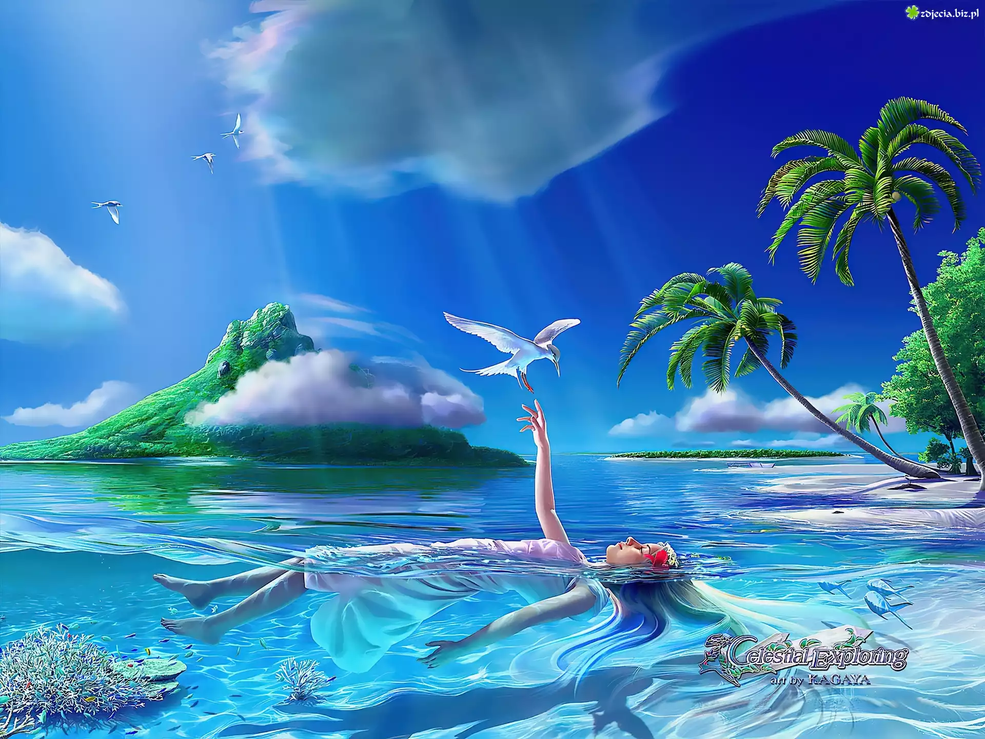 Zdjęcie Grafika, Dziewczyna, Woda, Mewa, Palmy, Kagaya