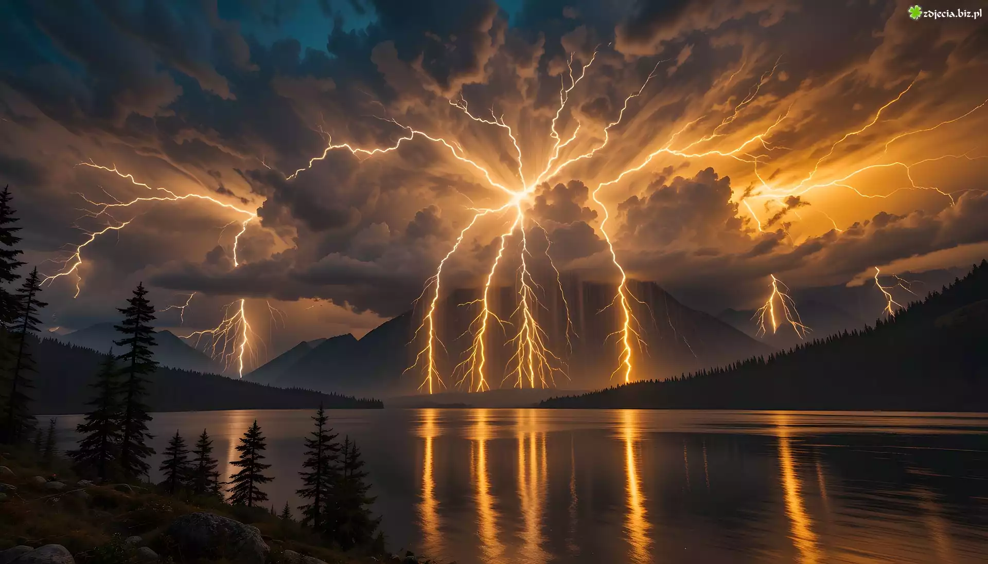 Zdjęcie Jezioro, Burza, Pioruny, Grafika AI, Drzewa, Chmury