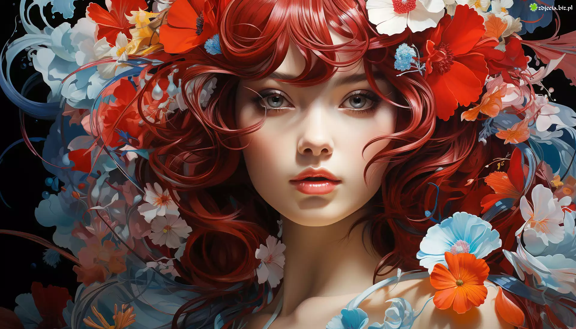 Zdjęcie Rudowłosa, Dziewczyna, Kwiaty, Grafika