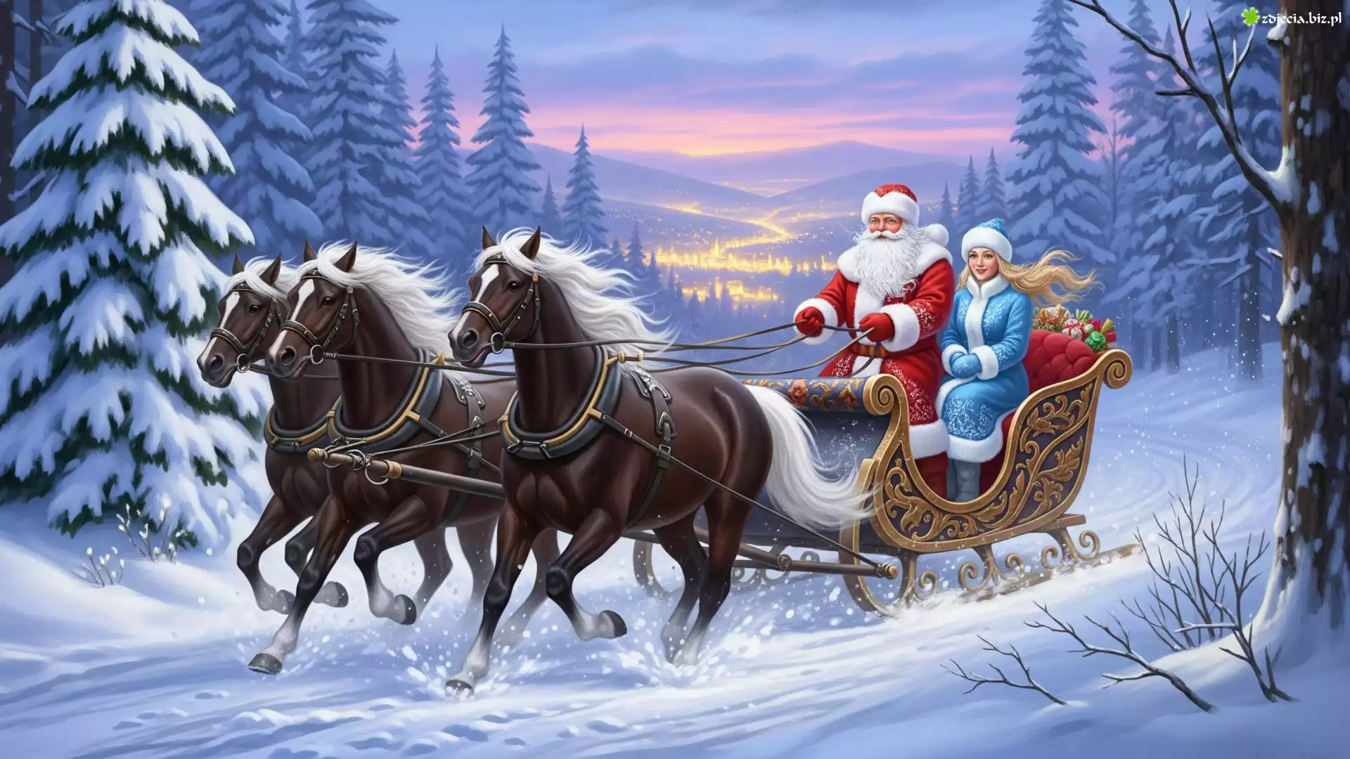 Zdjęcie Grafika, Zima, Zaprzęg, Konie, Sanie, Mikołaj, Śnieżynka, Drzewa, Ośnieżone