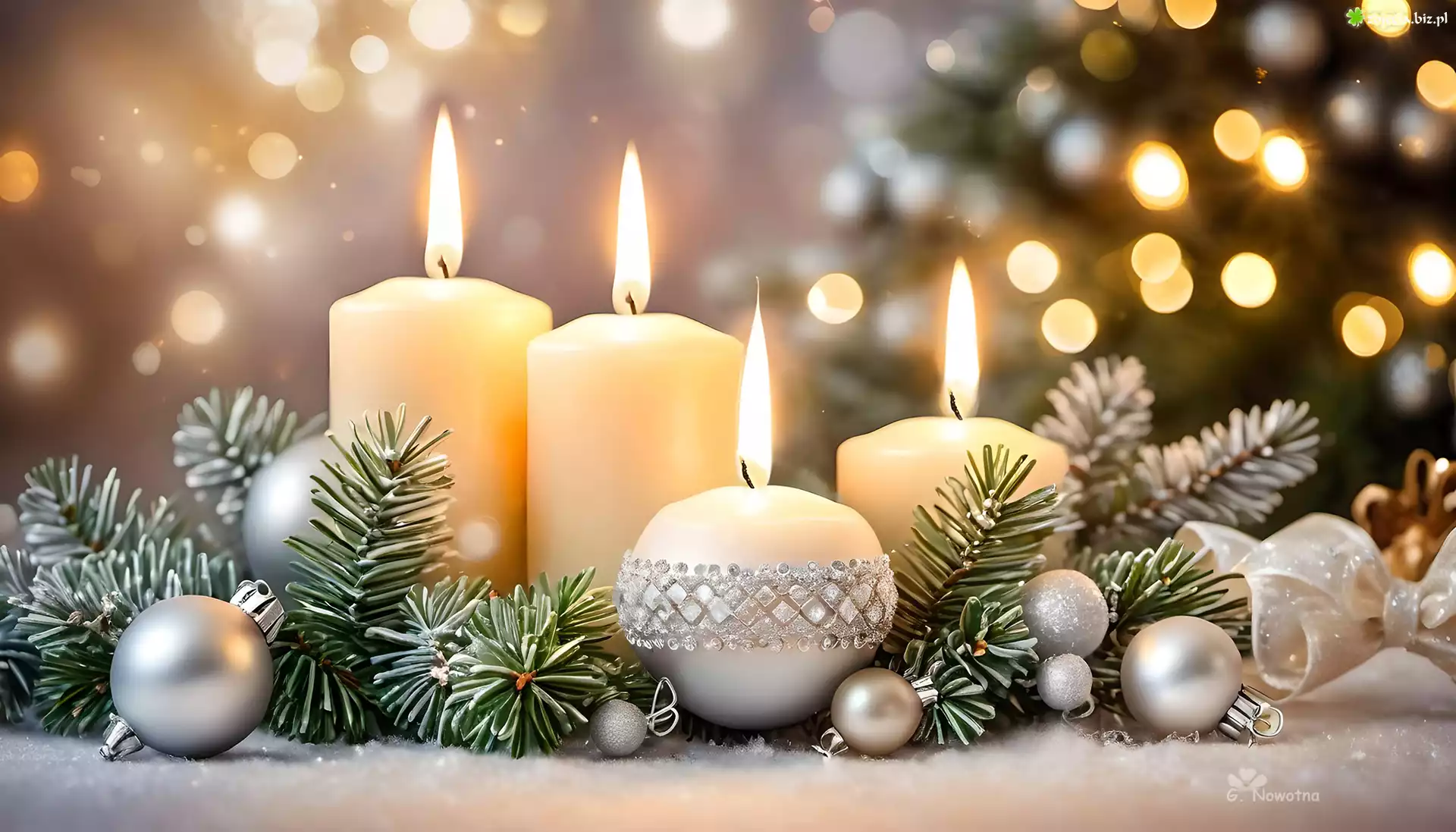 Zdjęcie Boże Narodzenie, Świece, Gałązki, Świerku, Srebrne, Bombki, Grafika