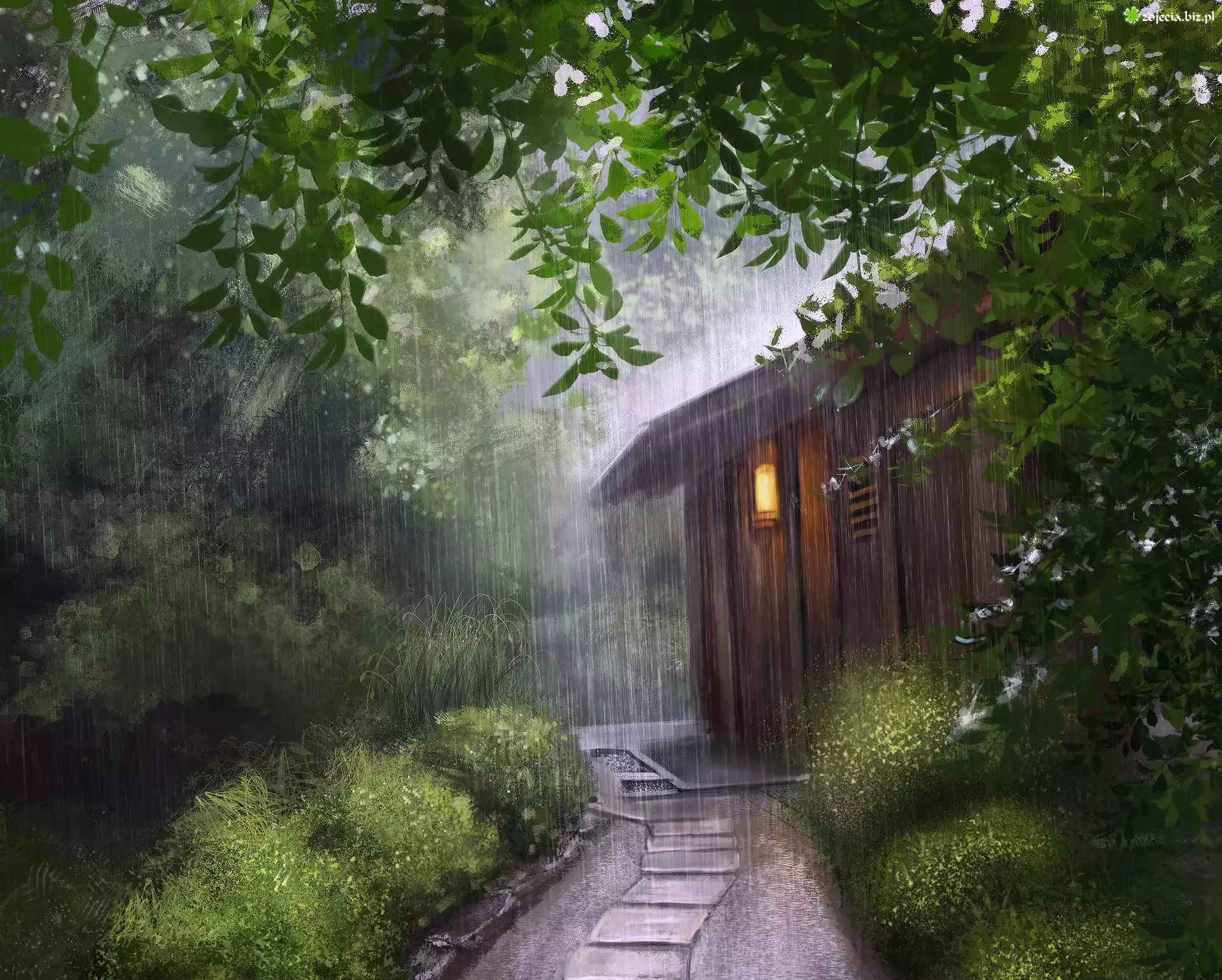 Zdjęcie Las, Drewniana, Chata, Dom, Światło, Ścieżka, Deszcz, Drzewa, Trawy, Grafika
