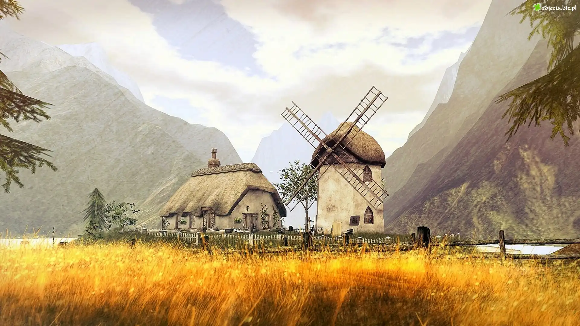 Zdjęcie Grafika, Góry, Dom, Wiatrak, Pole