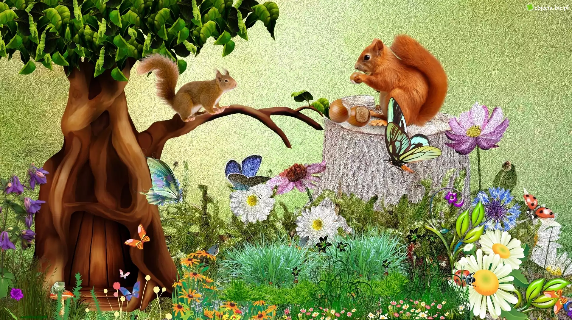 Zdjęcie Grafika, 2D, Kwiaty, Wiewiórki, Drzewo