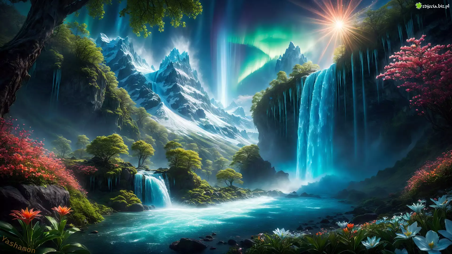 Zdjęcie Góry, Rzeka, Wodospady, Drzewa, Kwiaty, Zorza polarna, Grafika