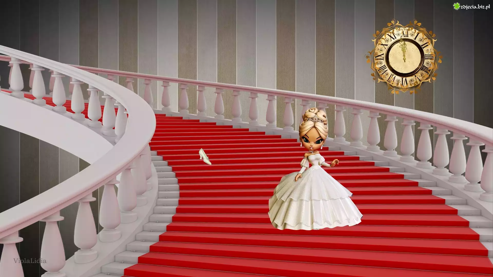Zdjęcie Grafika, Bajka, Kopciuszek, Schody, Zegar, Laleczka