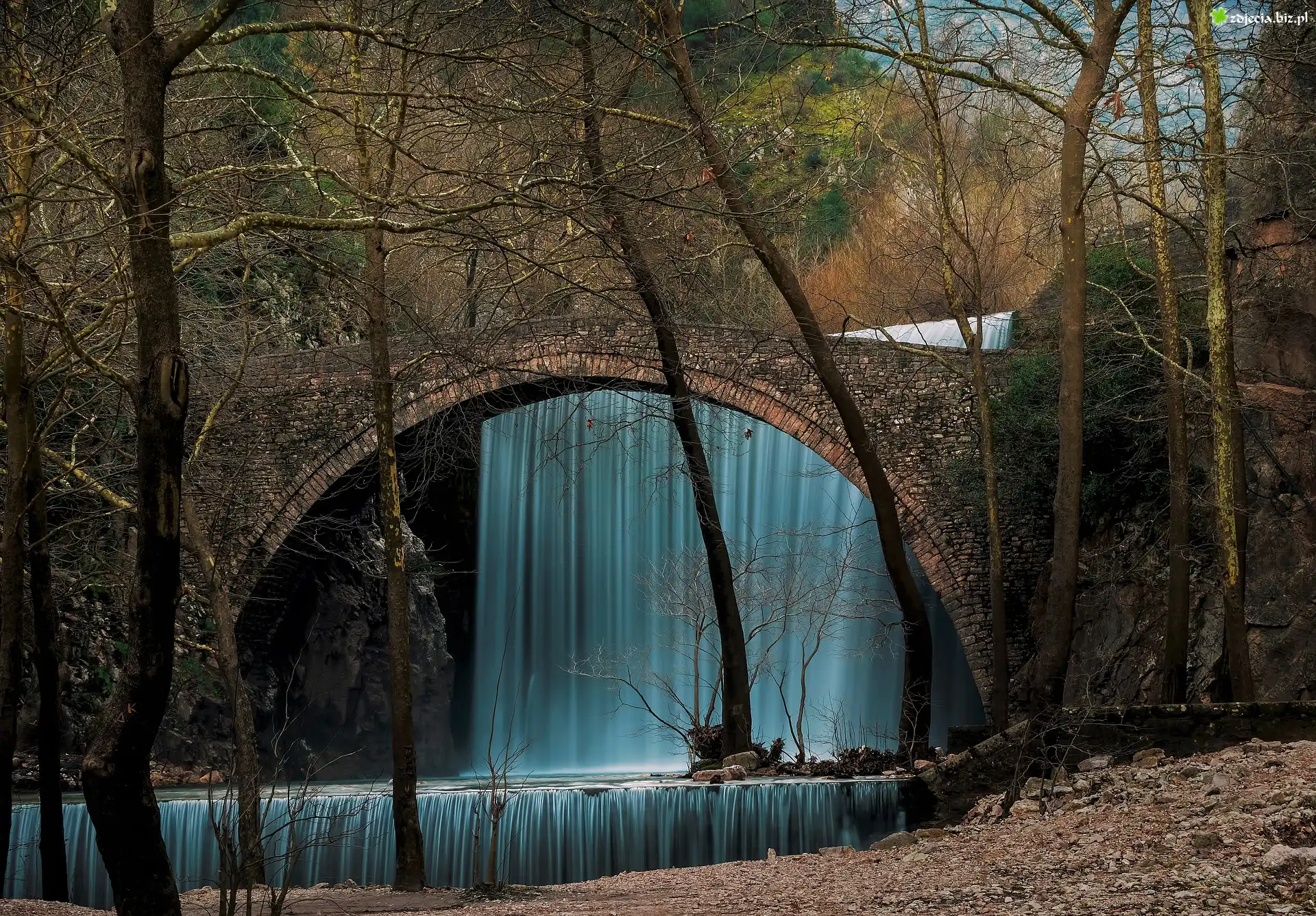 Zdjęcie Wodospad, Palaiokarya waterfalls, Drzewa, Rzeka Pinios, Kamienny, Most, Trikala, Grecja